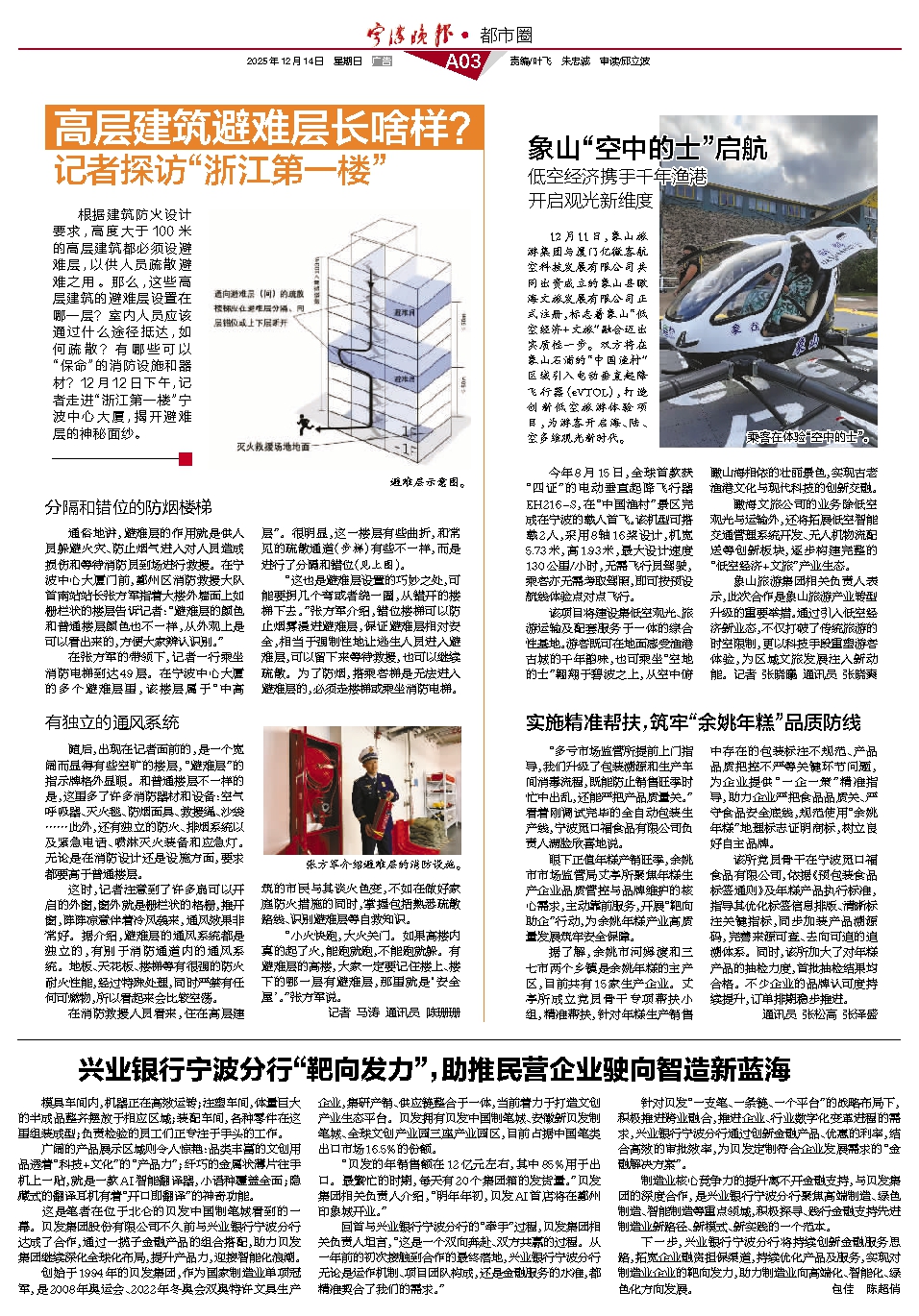 今年8月15日,全球首款获“四证”的电动垂直起降飞行器EH216-S,在“中国渔村”景区完成在宁波的载人首飞。该机型可搭载2人,采用8轴16桨设计,机宽5.73米,高1.93米,最大设计速度130公里/小时,无需飞行员驾驶,乘客亦无需考取驾照,即可按预设航线体验点对点飞行。