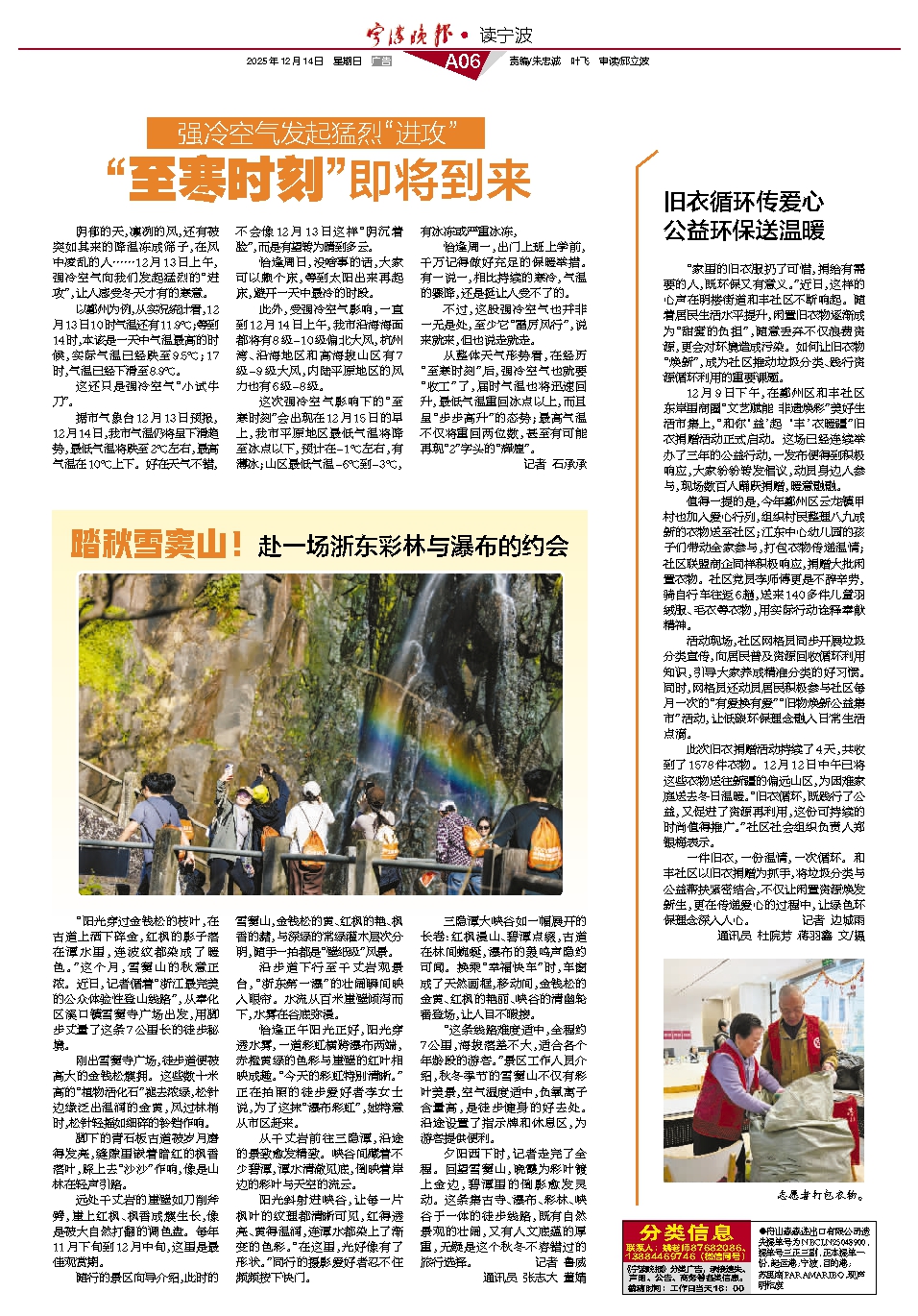 以鄞州为例,从实况统计看,12月13日10时气温还有11.9℃;等到14时,本该是一天中气温最高的时候,实际气温已经跌至9.5℃;17时,气温已经下滑至8.9℃。