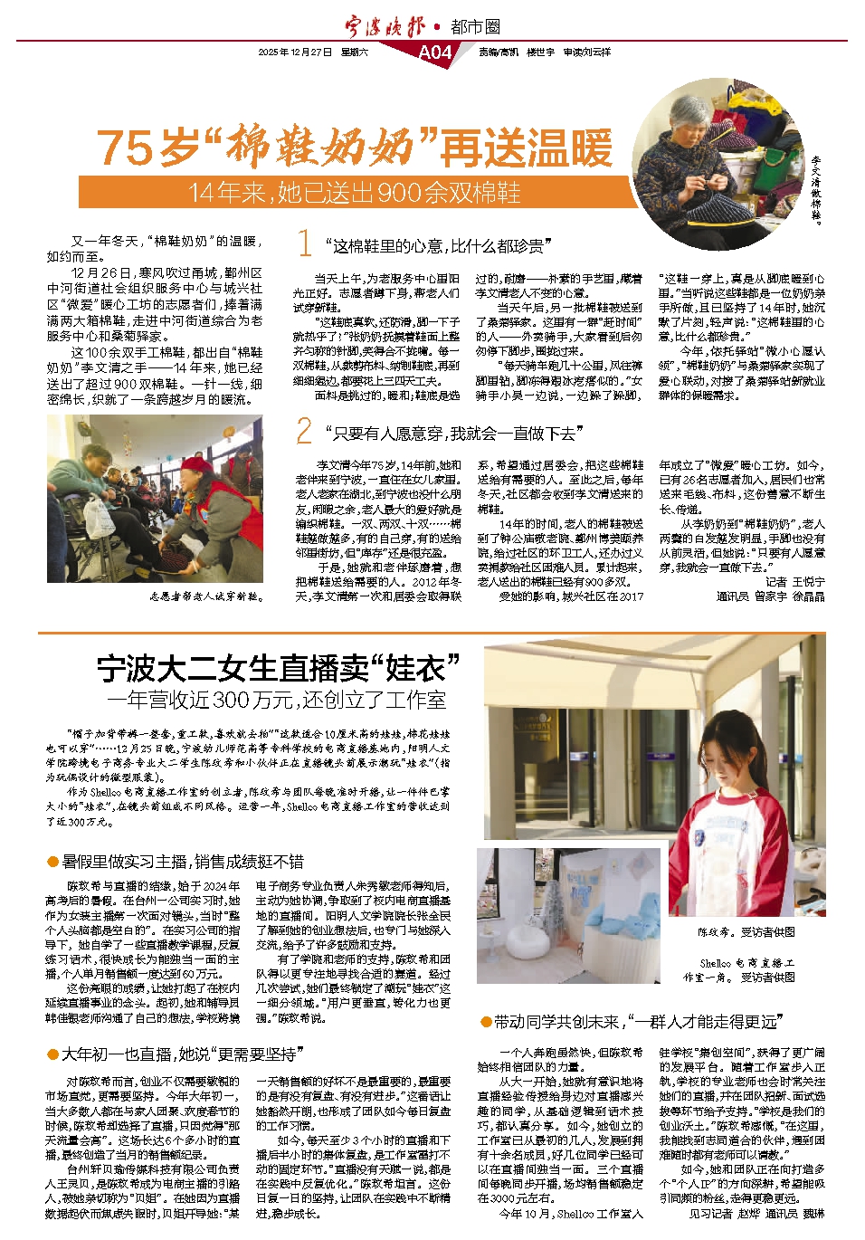 “帽子加背带裤一整套,重工款,喜欢就去拍”“这款适合10厘米高的娃娃,棉花娃娃也可以穿”……12月25日晚,宁波幼儿师范高等专科学校的电商直播基地内,阳明人文学院跨境电子商务专业大二学生陈玟希和小伙伴正在直播镜头前展示潮玩“娃衣”(指为玩偶设计的微型服装)。