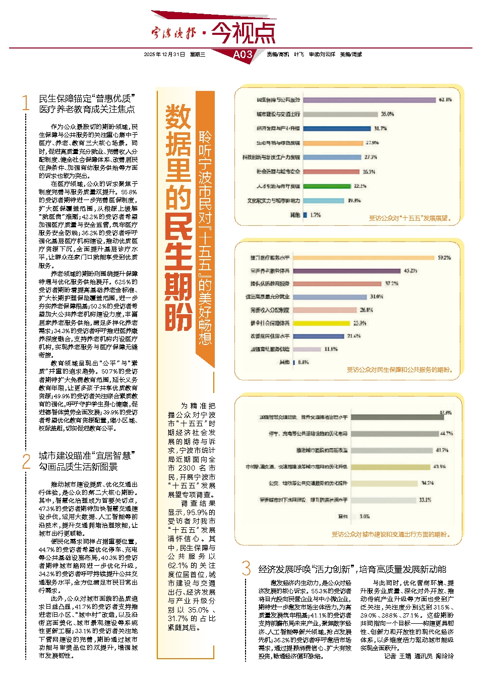调查结果显示,95.9%的受访者对我市“十五五”发展满怀信心。其中,民生保障与公共服务以62.1%的关注度位居首位,城市建设与交通出行、经济发展与产业升级分别以35.0%、31.7%的占比紧随其后。