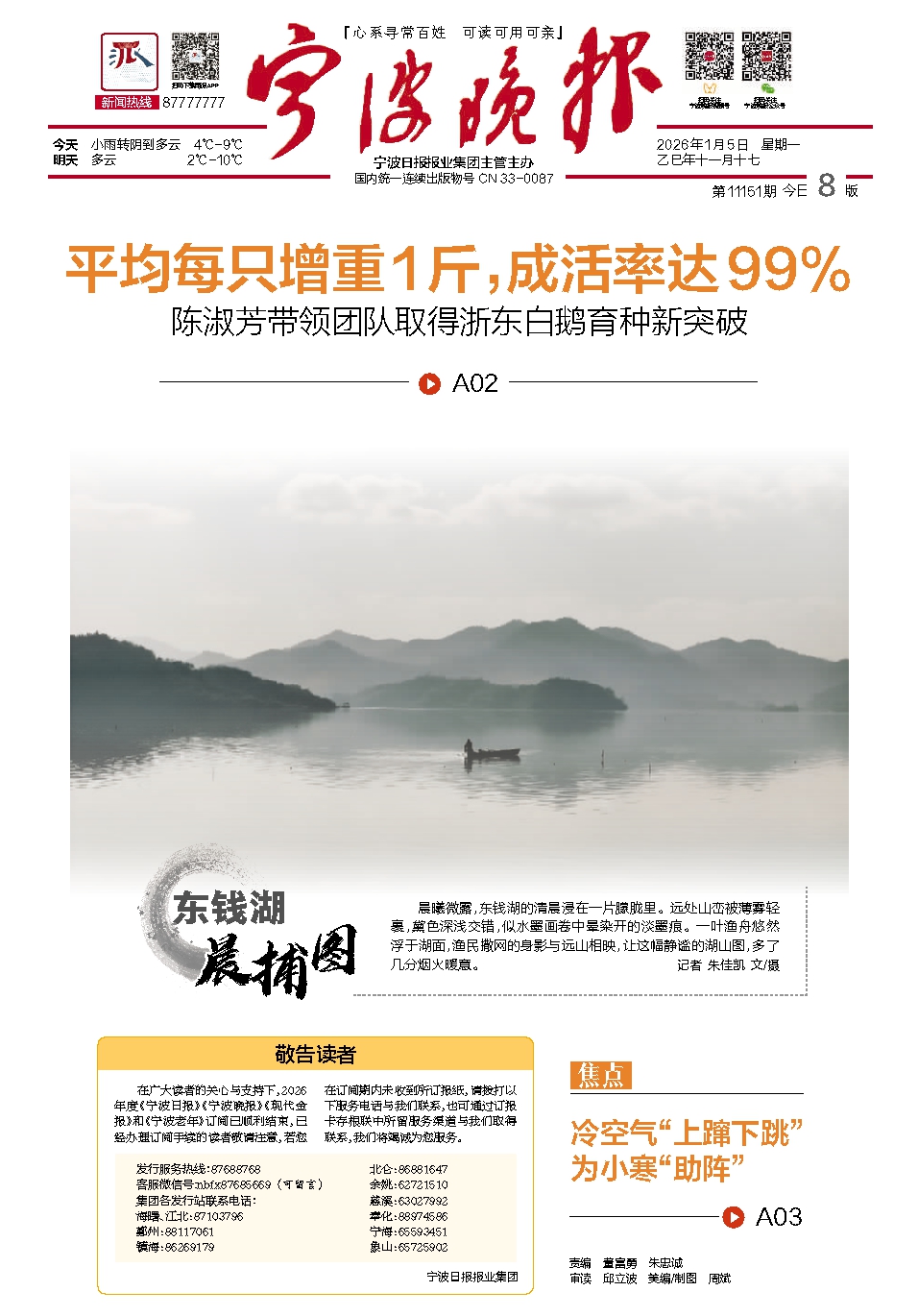 晨曦微露,东钱湖的清晨浸在一片朦胧里。远处山峦被薄雾轻裹,黛色深浅交错,似水墨画卷中晕染开的淡墨痕。一叶渔舟悠然浮于湖面,渔民撒网的身影与远山相映,让这幅静谧的湖山图,多了几分烟火暖意。记者 朱佳凯 文/摄