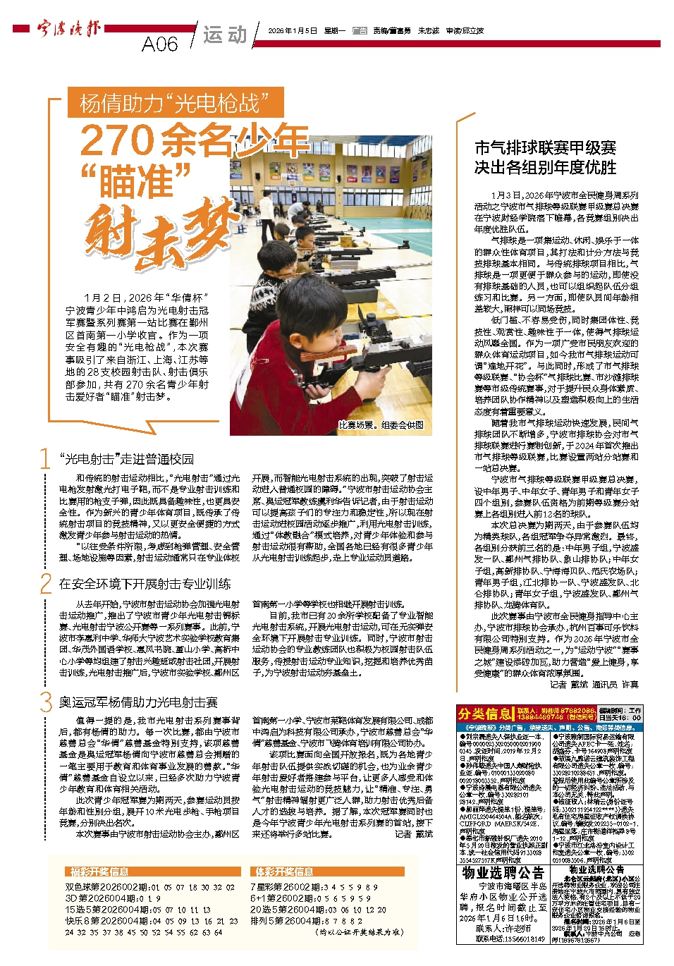 1月2日,2026年“华倩杯”宁波青少年中鸿启为光电射击冠军赛暨系列赛第一站比赛在鄞州区首南第一小学收官。作为一项安全有趣的“光电枪战”,本次赛事吸引了来自浙江、上海、江苏等地的28支校园射击队、射击俱乐部参加,共有270余名青少年射击爱好者“瞄准”射击梦。