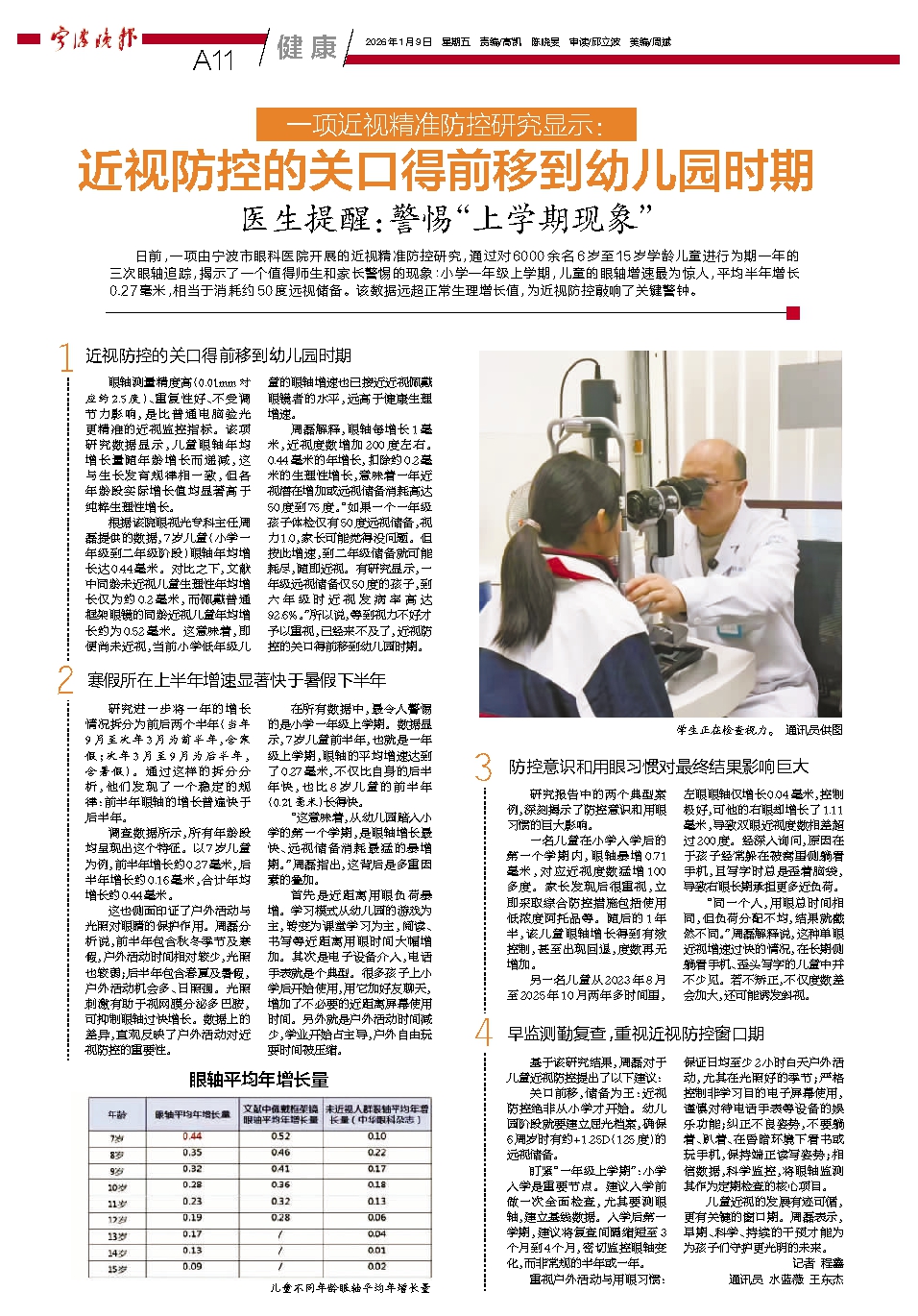 日前,一项由宁波市眼科医院开展的近视精准防控研究,通过对6000余名6岁至15岁学龄儿童进行为期一年的三次眼轴追踪,揭示了一个值得师生和家长警惕的现象:小学一年级上学期,儿童的眼轴增速最为惊人,平均半年增长0.27毫米,相当于消耗约50度远视储备。该数据远超正常生理增长值,为近视防控敲响了关键警钟。