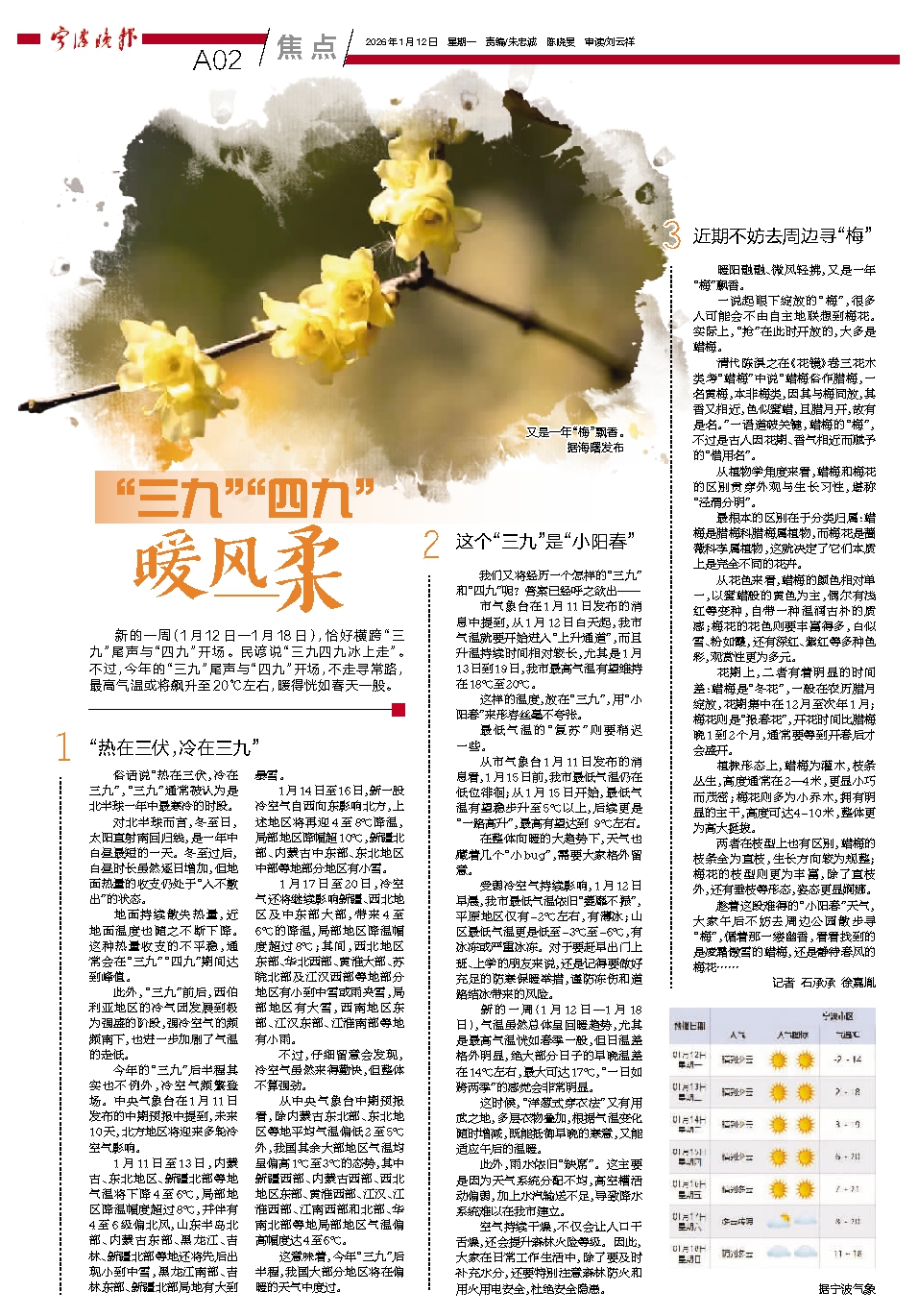 新的一周(1月12日—1月18日),恰好横跨“三九”尾声与“四九”开场。民谚说“三九四九冰上走”。不过,今年的“三九”尾声与“四九”开场,不走寻常路,最高气温或将飙升至20℃左右,暖得恍如春天一般。