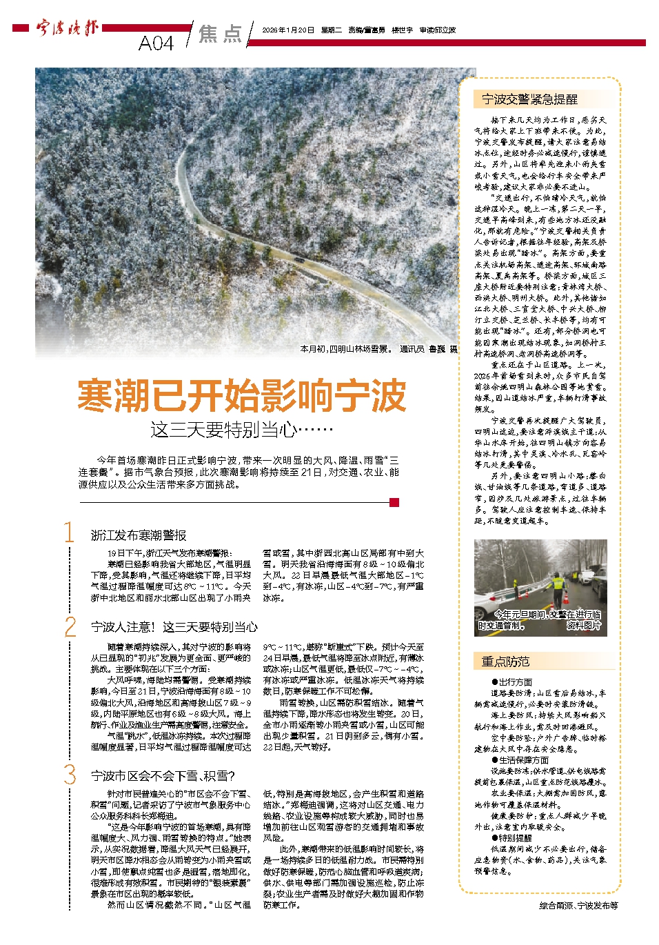 接下来几天均为工作日,恶劣天气将给大家上下班带来不便。为此,宁波交警发布提醒,请大家注意易结冰点位,途经时务必减速慢行,谨慎通过。另外,山区将率先迎来小雨夹雪或小雪天气,也会给行车安全带来严峻考验,建议大家非必要不进山。
