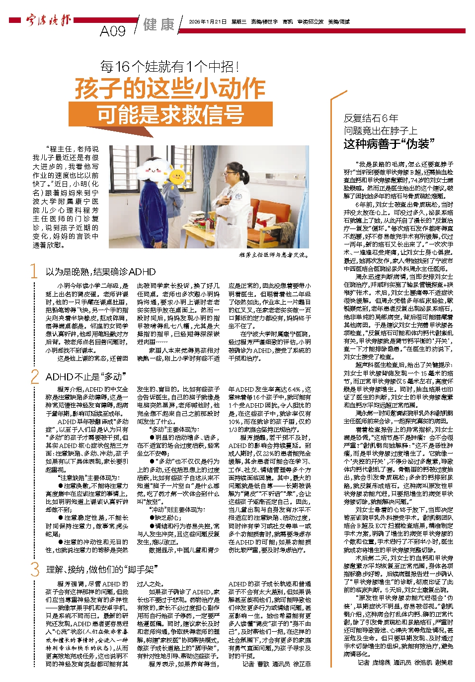 程芳介绍,ADHD的中文全称是注意缺陷多动障碍,这是一种常见慢性神经发育障碍,起病于童年期,影响可延续至成年。