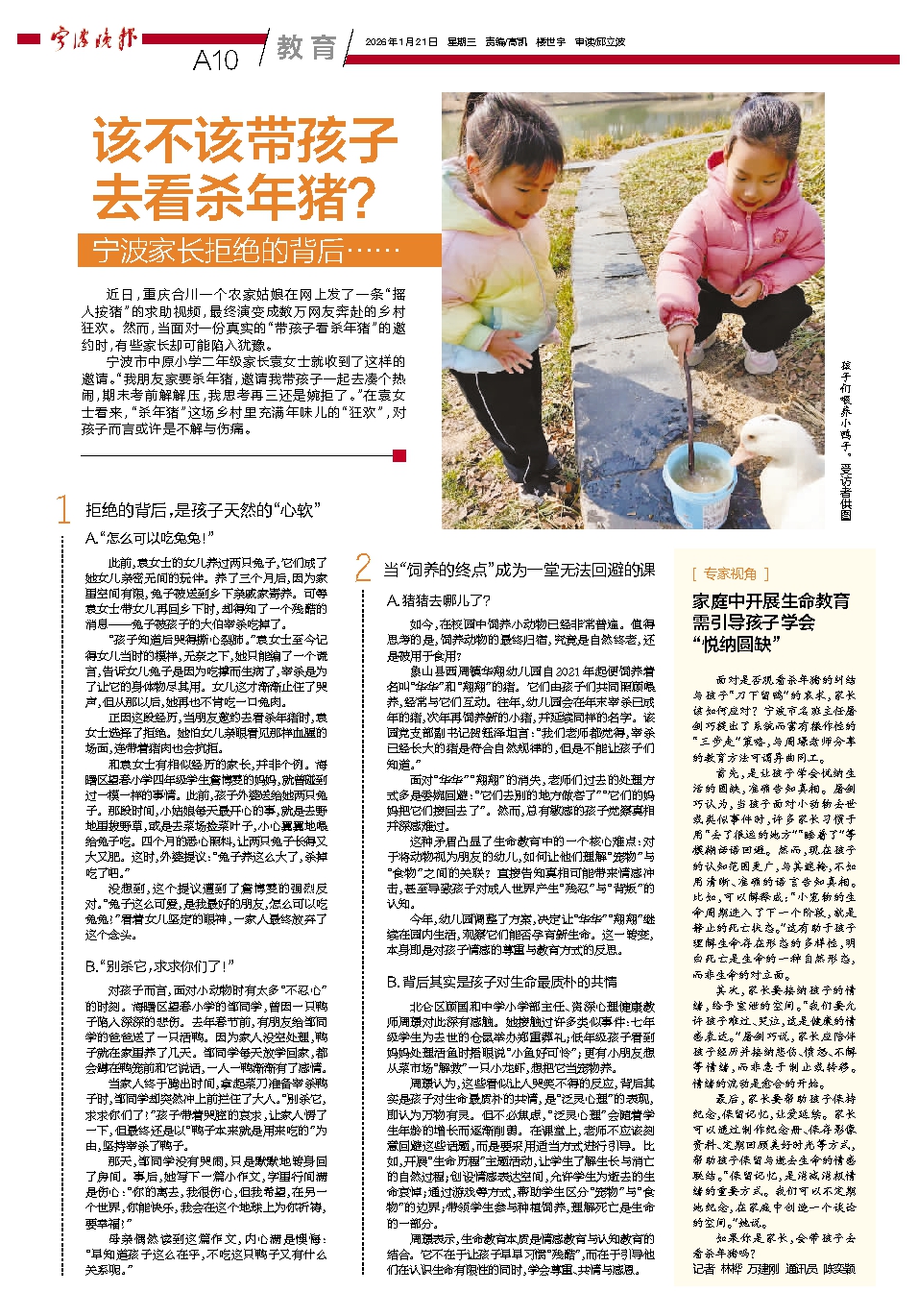 面对是否观看杀年猪的纠结与孩子“刀下留鸭”的哀求,家长该如何应对?宁波市名班主任屠剑巧提出了系统而富有操作性的“三步走”策略,与周璟老师分享的教育方法可谓异曲同工。