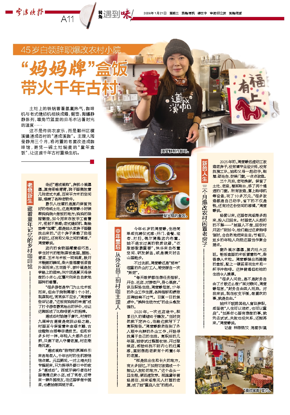 这不是传统农家乐,而是鄞州区横溪镇道成岙村的“道成溪咖”。主理人周莹静用三个月,将闲置的老屋改造成咖啡馆,更凭一碗土灶焖煮的“童年盒饭”,让这座千年古村重焕生机。