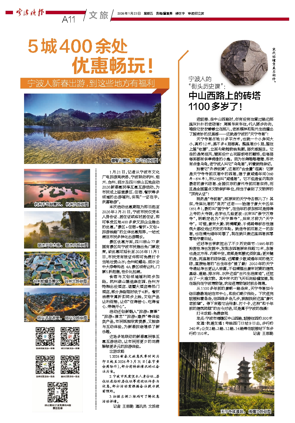 从1100多年前的唐朝一路走来,天宁寺塔如今依旧稳稳地站在市中心,和我们朝夕相处。下次逛完鼓楼别着急走,往西侧多走几步,就能找到这座“唐代老前辈”。停下来跟它合张影、打个卡,这种“和千年前的建筑同框”的古今对话,可是属于宁波的浪漫!