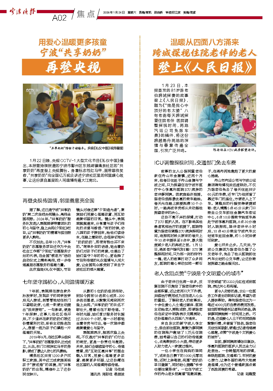 1月22日晚,央视CCTV-1大型文化节目《礼仪中国》播出,本报曾持续报道的宁波市鄞州区东钱湖镇清泉社区的“共享奶奶”再度登上央视舞台。身着标志性红马甲,面带慈祥笑容,“共享奶奶”向全国亿万观众讲述宁波社区里的邻里暖心故事,让这份源自基层的人间温情传遍大江南北。