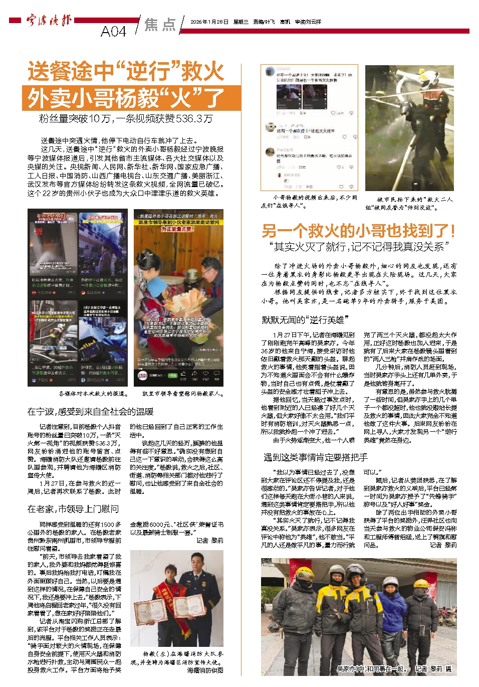 这几天,送餐途中“逆行”救火的外卖小哥杨毅经过宁波晚报等宁波媒体报道后,引发其他省市主流媒体、各大社交媒体以及央媒的关注。央视新闻、人民网、新华社、新华网、国家应急广播、工人日报、中国消防、山西广播电视台、山东交通广播、美丽浙江、武汉发布等官方媒体纷纷转发这条救火视频,全网流量已破亿。这个22岁的贵州小伙子也成为大众口中津津乐道的救火英雄。