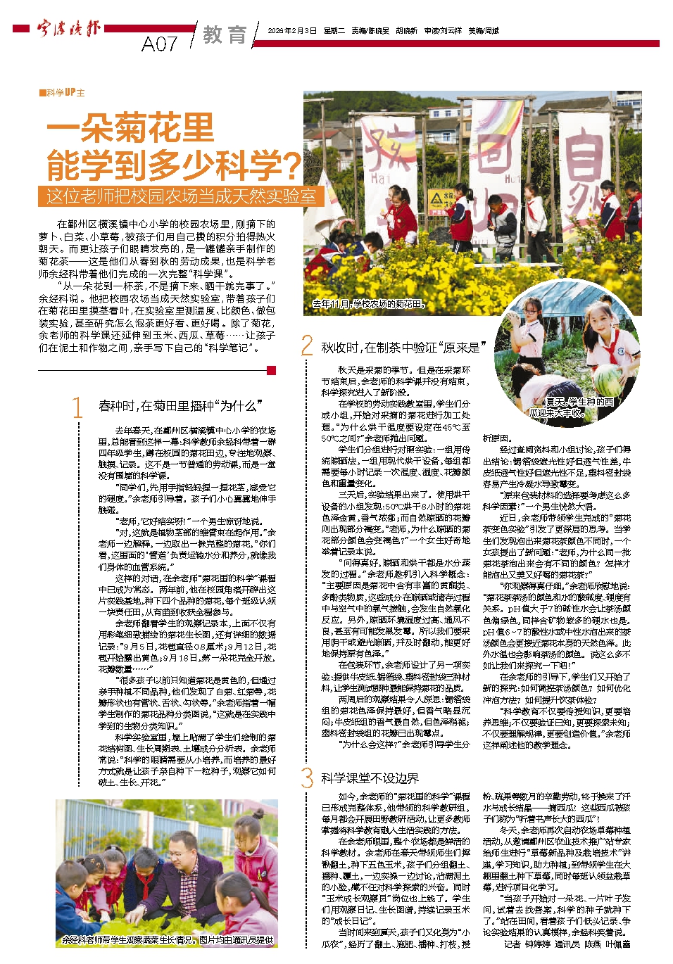 去年春天,在鄞州区横溪镇中心小学的农场里,总能看到这样一幕:科学教师余经科带着一群四年级学生,蹲在校园的菊花田边,专注地观察、触摸、记录。这不是一节普通的劳动课,而是一堂没有围墙的科学课。
