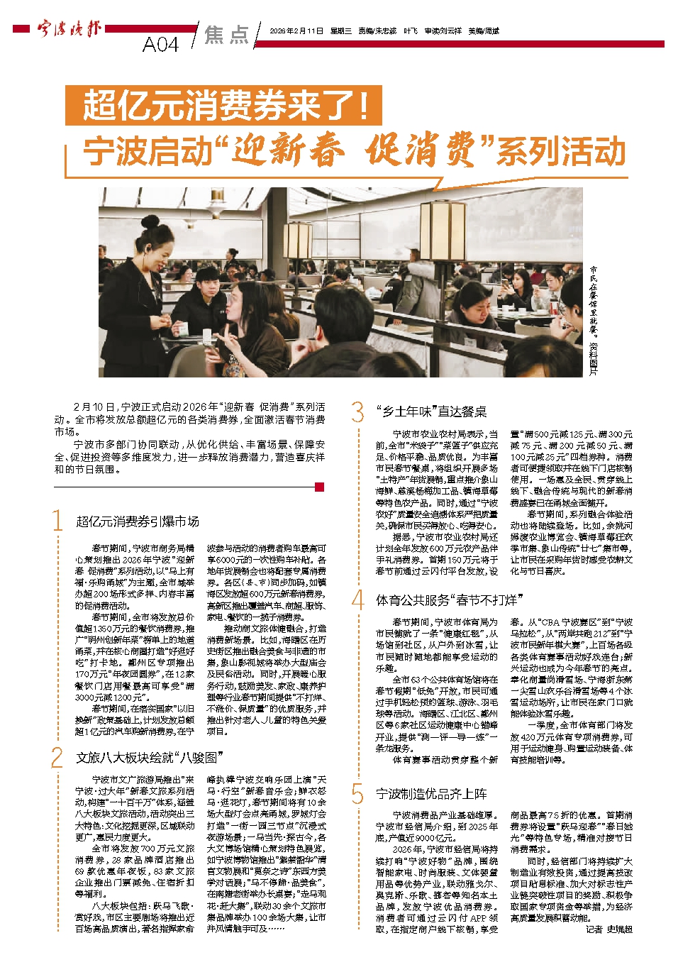2月10日,宁波正式启动2026年“迎新春 促消费”系列活动。全市将发放总额超亿元的各类消费券,全面激活春节消费市场。