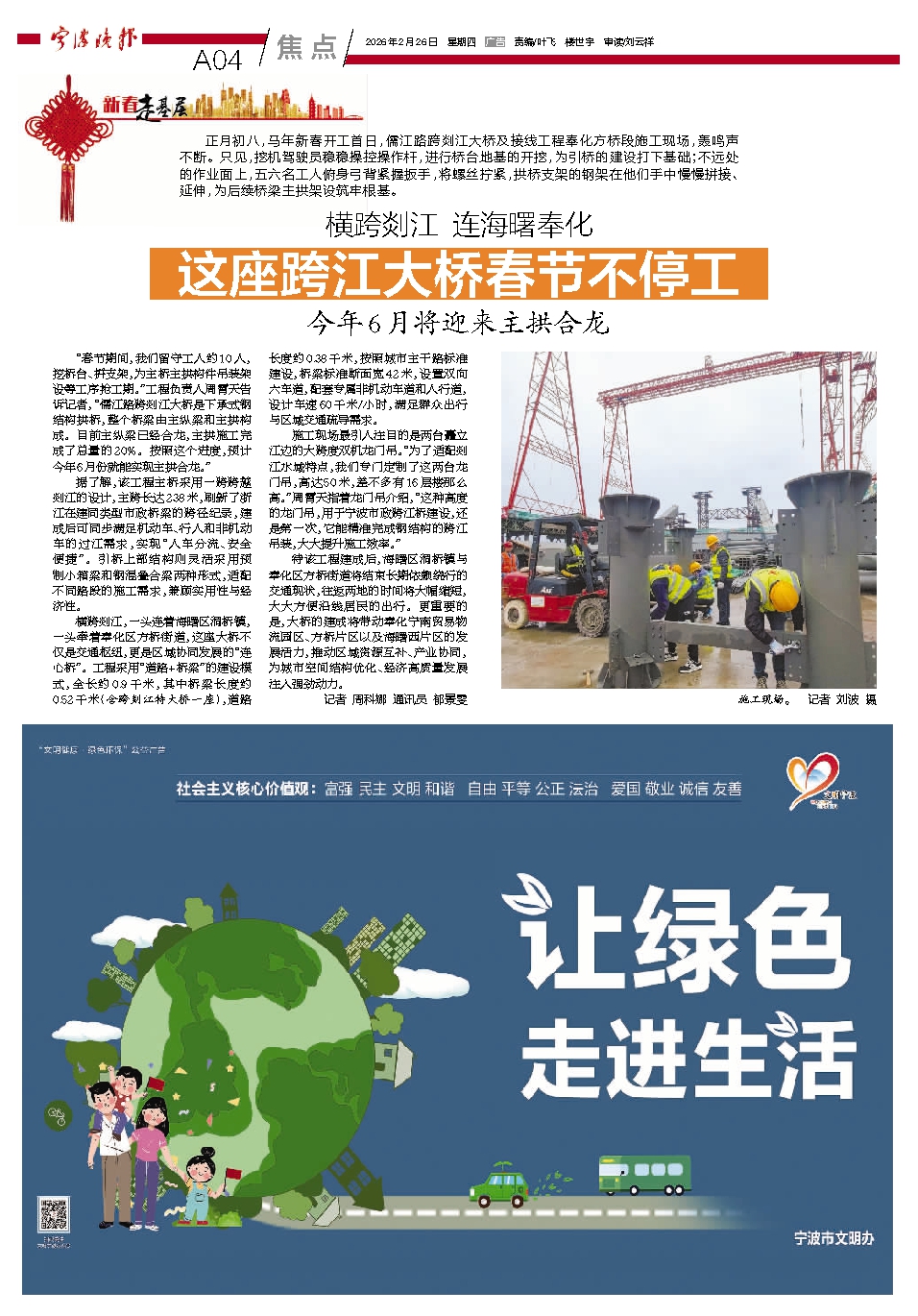 待该工程建成后,海曙区洞桥镇与奉化区方桥街道将结束长期依赖绕行的交通现状,往返两地的时间将大幅缩短,大大方便沿线居民的出行。更重要的是,大桥的建成将带动奉化宁南贸易物流园区、方桥片区以及海曙西片区的发展活力,推动区域资源互补、产业协同,为城市空间结构优化、经济高质量发展注入强劲动力。