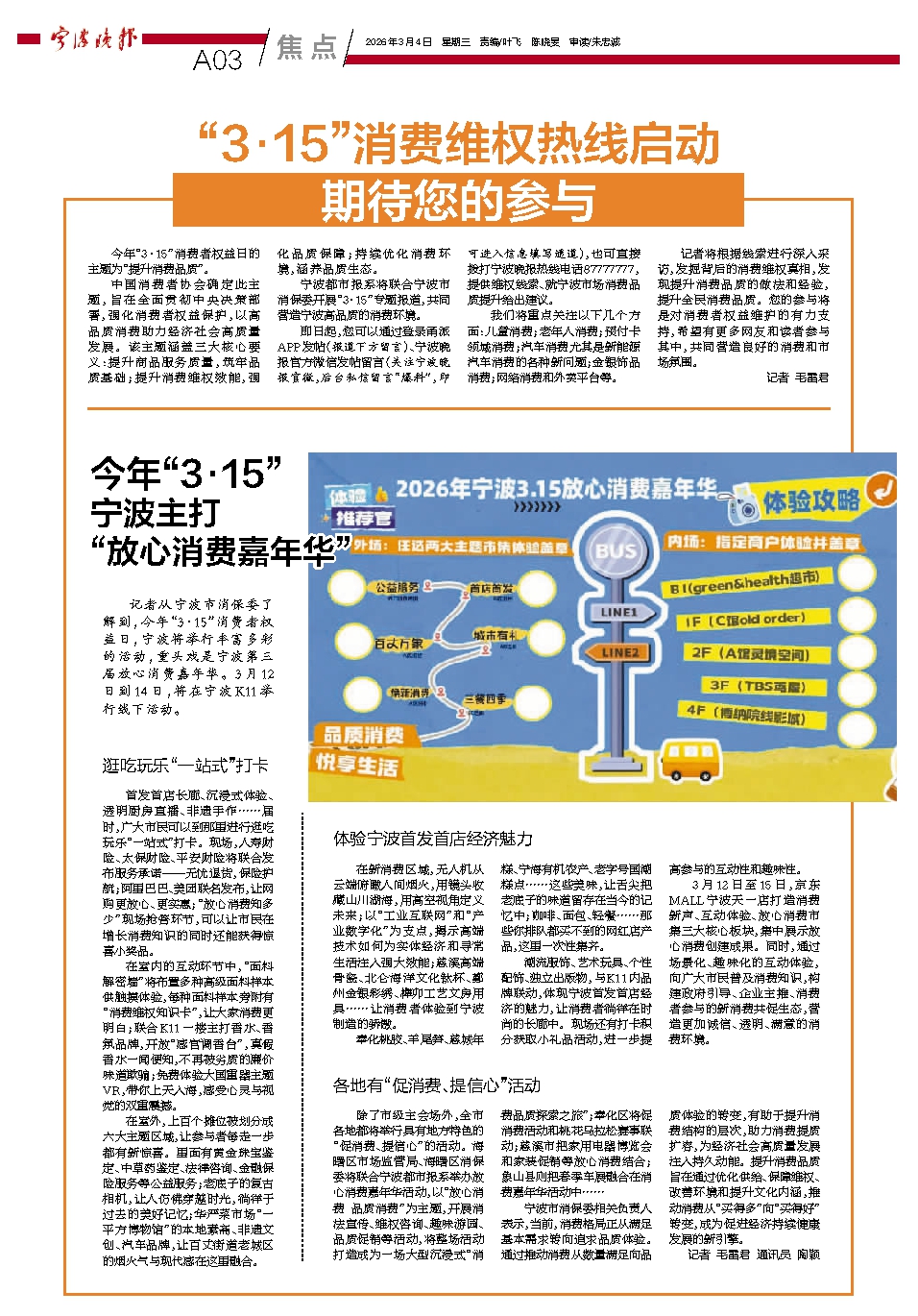 宁波都市报系将联合宁波市消保委开展“3·15”专题报道,共同营造宁波高品质的消费环境。