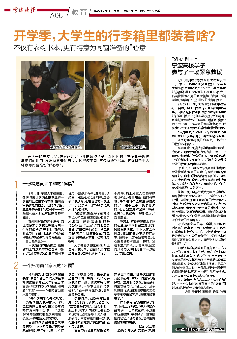 开学季的宁波大学,在春雨绵绵中迎来返校学子。沉甸甸的行李箱轮子碾过湿漉漉的地面,发出有节奏的声响。这些箱子里,不仅有衣物书本,更有箱子主人特意为同窗准备的“心意”。