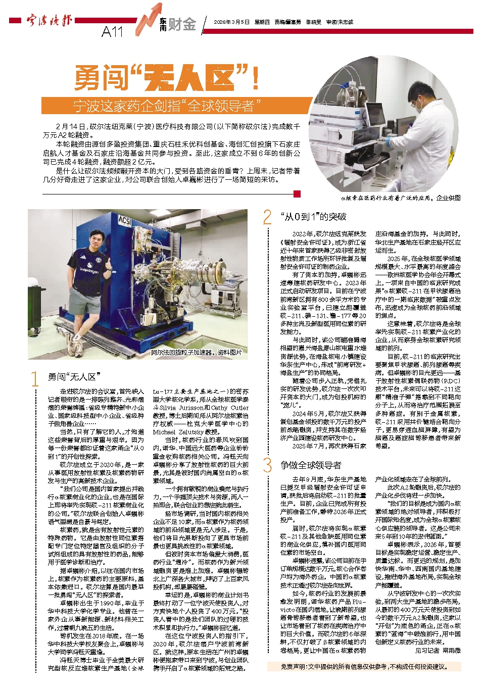 从宁波研发中心的一次次实验,到两大生产基地的稳步布局,从最初的400万元天使投资到如今的数千万元A2轮融资,这家以“开创”为底色的甬企,正在α核素的“蓝海”中破浪前行,用中国创新定义核药行业的未来。