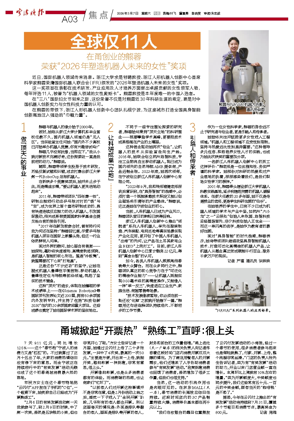 在熊蓉的带领下,浙江人形机器人创新中心团队扎根宁波,为这座城市打造全国具身智能创新高地注入强劲的“巾帼力量”。