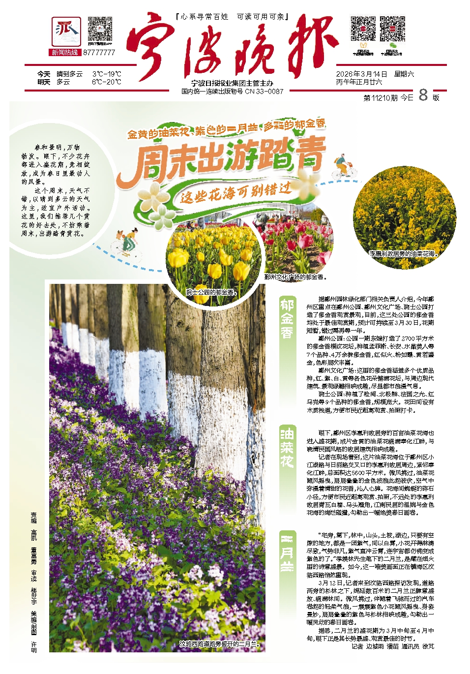 据鄞州园林绿化部门相关负责人介绍,今年鄞州区重点在鄞州公园、鄞州文化广场、院士公园打造了郁金香观赏景观,目前,这三处公园的郁金香均处于最佳观赏期,预计可持续至3月30日,花期短暂,错过需再等一年。
