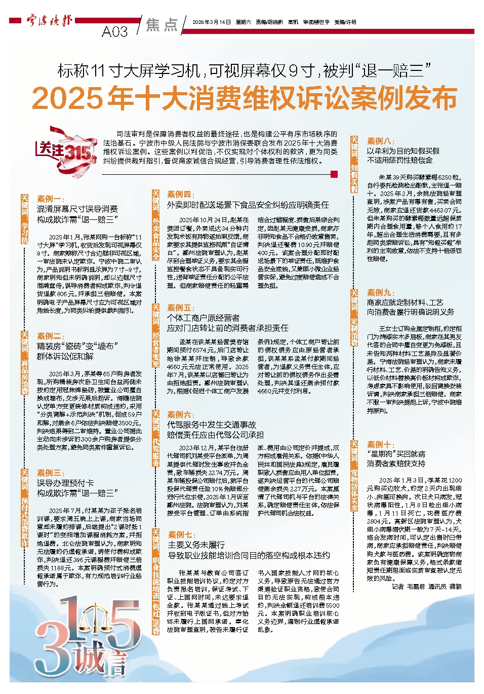 司法审判是保障消费者权益的最终途径,也是构建公平有序市场秩序的法治基石。宁波市中级人民法院与宁波市消保委联合发布2025年十大消费维权诉讼案例。这些案例以判促治,不仅实现对个体权利的救济,更为同类纠纷提供裁判指引,督促商家诚信合规经营,引导消费者理性依法维权。