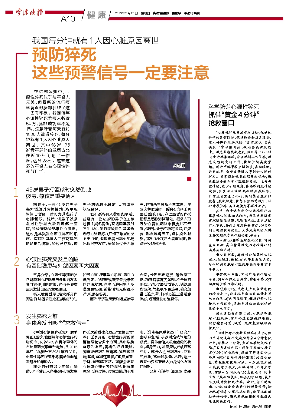 猝死的到来如此突然而残酷,这不禁让人产生疑问,在发生猝死之前身体会发出“求救信号”吗?王勇介绍,心源性猝死的预警信号包含多个方面,其中以胸痛最为常见,再者为呼吸困难。胸痛多表现为压迫感、紧绷感或疼痛感,痛感还可能扩散至肩膀、手臂、背部或下颌。可能会出现心悸或心律不齐的情况,明显感觉到心跳过快、过慢或跳动不规则。即使在休息状态下,也会产生呼吸急促、呼吸困难或气短的感受。身体会陷入极度疲倦的状态,浑身无力,甚至无法完成日常活动。部分人会出现恶心、呕吐的症状,常伴随头晕、出汗,这一表现也容易被误认为是消化方面的问题。