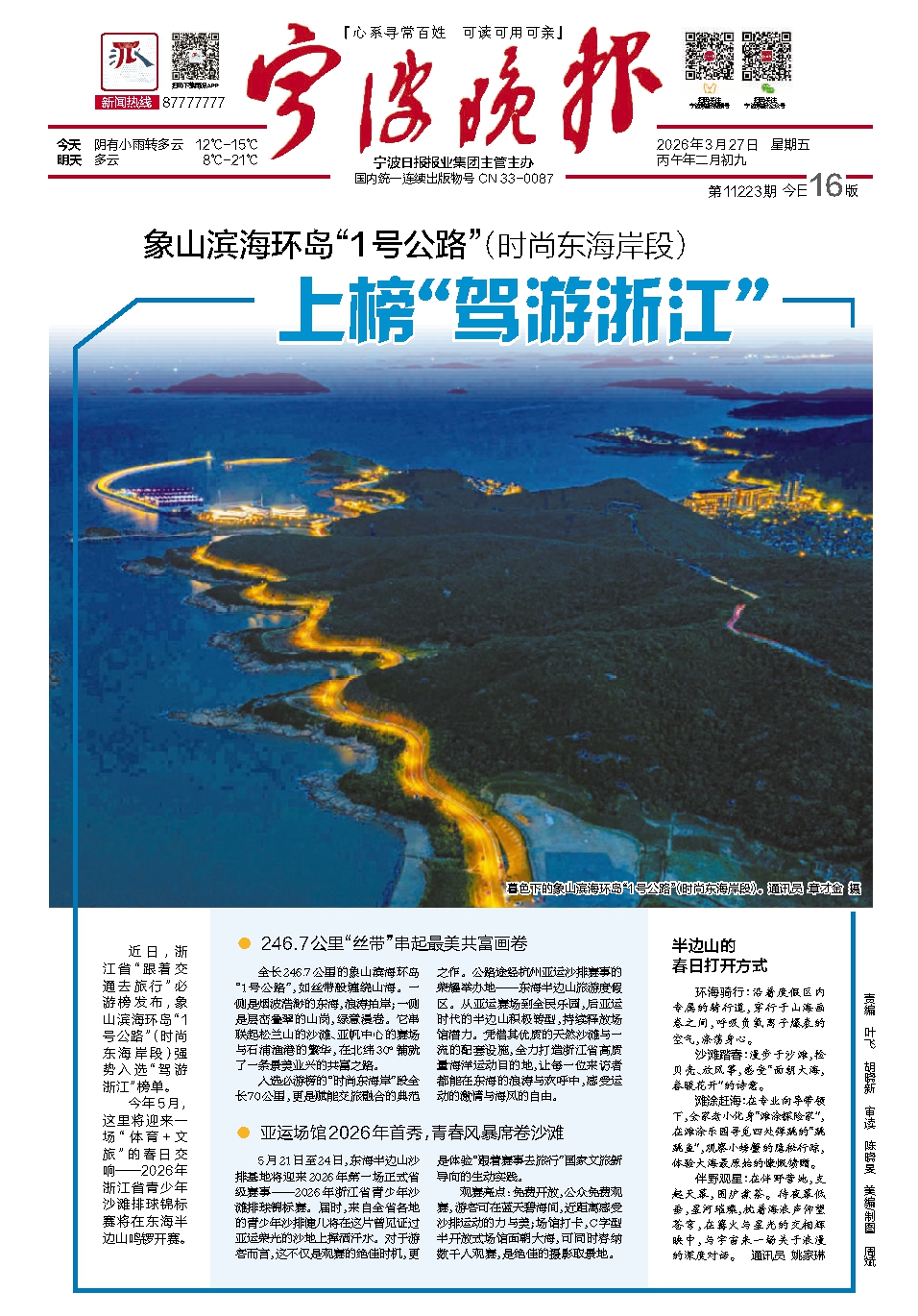 全长246.7公里的象山滨海环岛“1号公路”,如丝带般缠绕山海。一侧是烟波浩渺的东海,浪涛拍岸;一侧是层峦叠翠的山岗,绿意漫卷。它串联起松兰山的沙滩、亚帆中心的赛场与石浦渔港的繁华,在北纬30°铺就了一条景美业兴的共富之路。