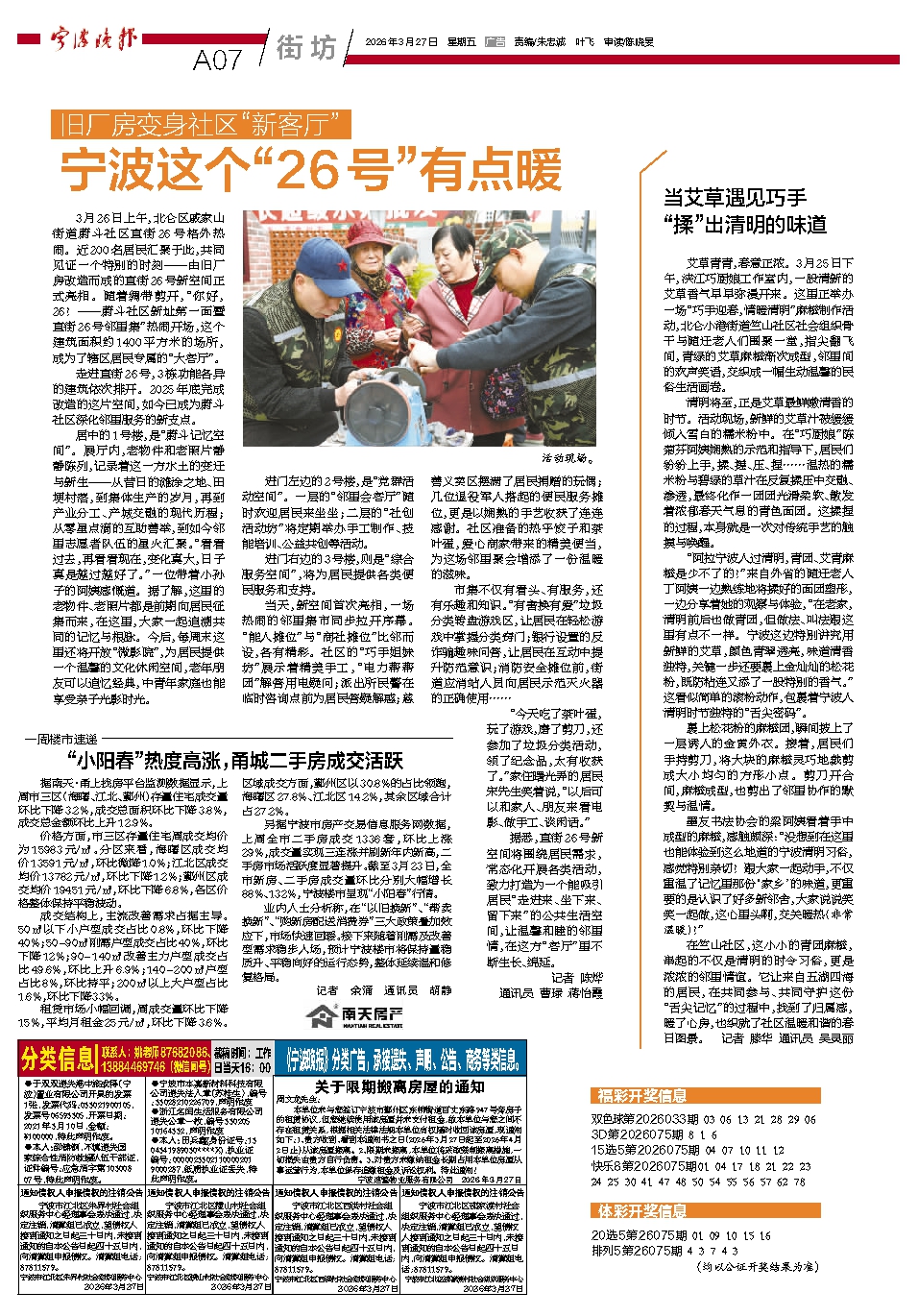 3月26日上午,北仑区戚家山街道蔚斗社区直街26号格外热闹。近200名居民汇聚于此,共同见证一个特别的时刻——由旧厂房改造而成的直街26号新空间正式亮相。随着绸带剪开,“你好,26!——蔚斗社区新址第一面暨直街26号邻里集”热闹开场,这个建筑面积约1400平方米的场所,成为了辖区居民专属的“大客厅”。