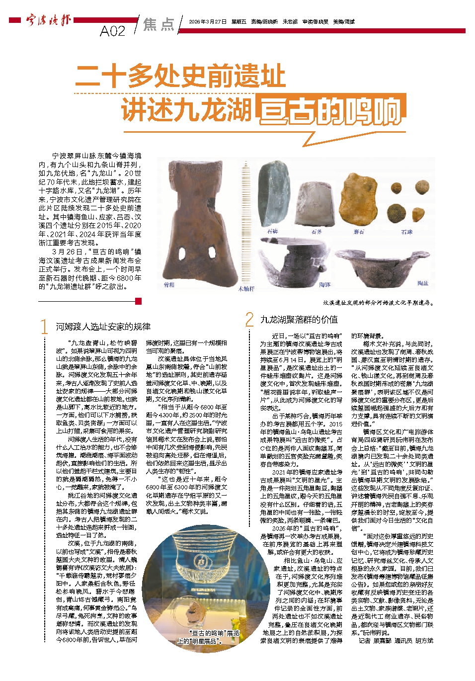 3月26日,“亘古的鸣响”镇海汶溪遗址考古成果新闻发布会正式举行。发布会上,一个时间早至新石器时代晚期、距今6800年的“九龙湖遗址群”呼之欲出。