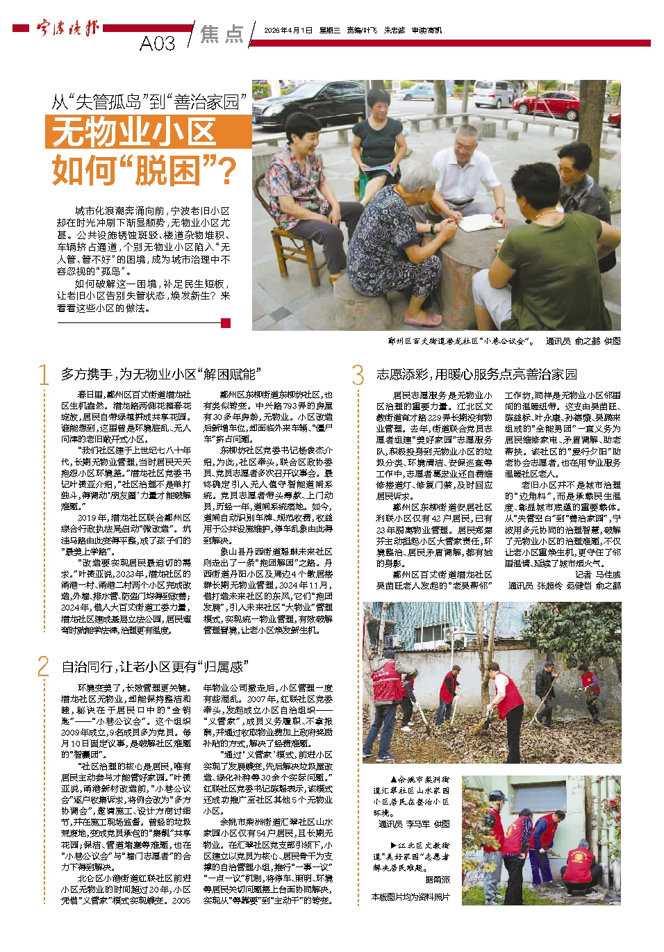 老旧小区并不是城市治理的“边角料”,而是承载民生温度、彰显城市底蕴的重要载体。从“失管空白”到“善治家园”,宁波用多元协同的治理智慧,破解了无物业小区的治理难题,不仅让老小区重焕生机,更守住了邻里温情、延续了城市烟火气。
