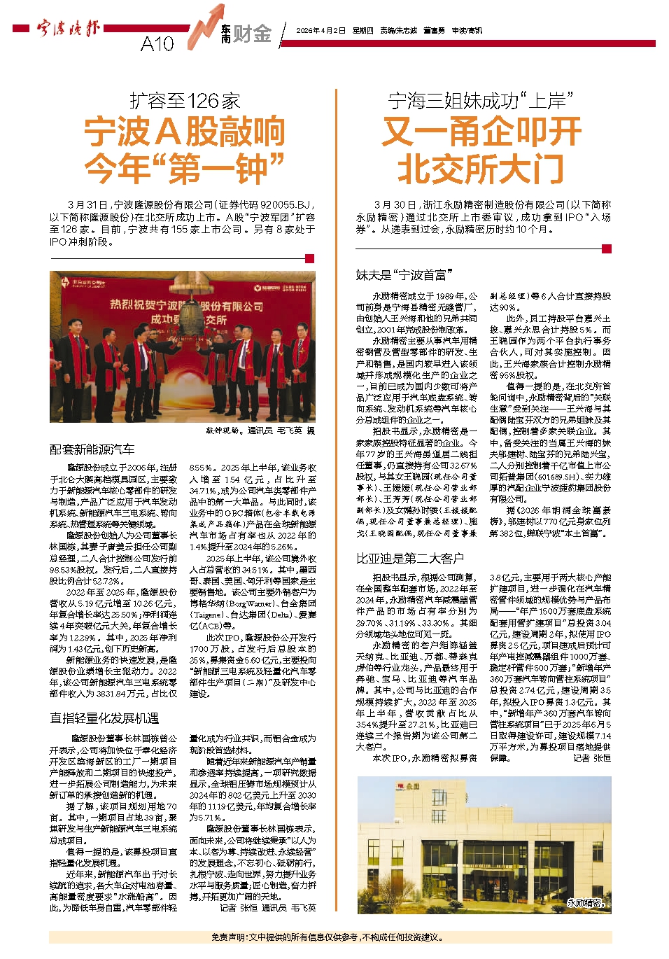 本次IPO,永励精密拟募资3.8亿元,主要用于两大核心产能扩建项目,进一步强化在汽车精密管件领域的规模优势与产品布局——“年产1500万套底盘系统配套用管扩建项目”总投资3.04亿元,建设周期2年,拟使用IPO募资2.5亿元,项目建成后预计可年产电控减震器组件1000万套、稳定杆管件500万套;“新增年产360万套汽车转向管柱系统项目”总投资2.74亿元,建设周期3.5年,拟投入IPO募资1.3亿元。其中,“新增年产360万套汽车转向管柱系统项目”已于2025年6月5日取得建设许可,建设规模7.14万平方米,为募投项目落地提供保障。 记者 张恒