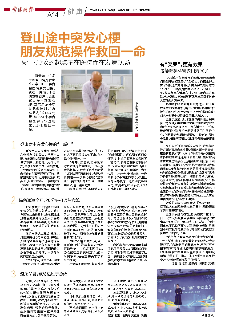 两天前,40多岁的登山爱好者老陈从象山红十字台胞医院康复出院。就在一周前,他与朋友在石浦大金山登山途中突发心梗,幸亏朋友接受过急救培训。“教科书式”的现场处置,辖区红十字台胞医院的快速响应,让他捡回一命。