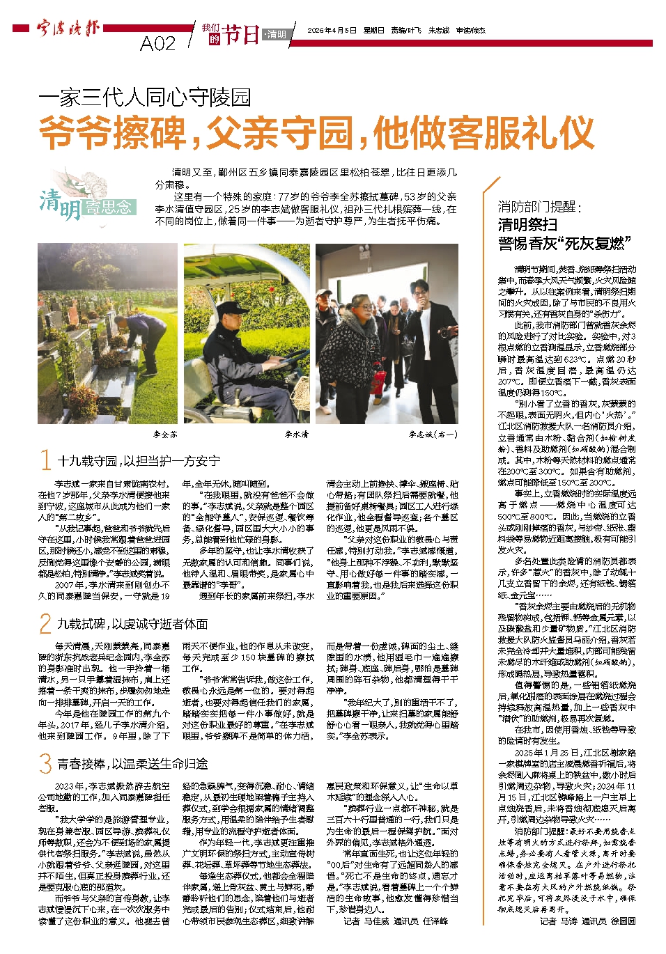 消防部门提醒:最好不要用烧香点烛等有明火的方式进行祭拜,如需烧香点蜡,务必要有人看管火源,离开时要确保香烛完全熄灭。在户外进行祭祀活动时,应远离枯草落叶等易燃物,注意不要在有大风的户外燃烧纸钱。祭祀完毕后,可将灰烬浸没于水中,确保彻底熄灭后再离开。