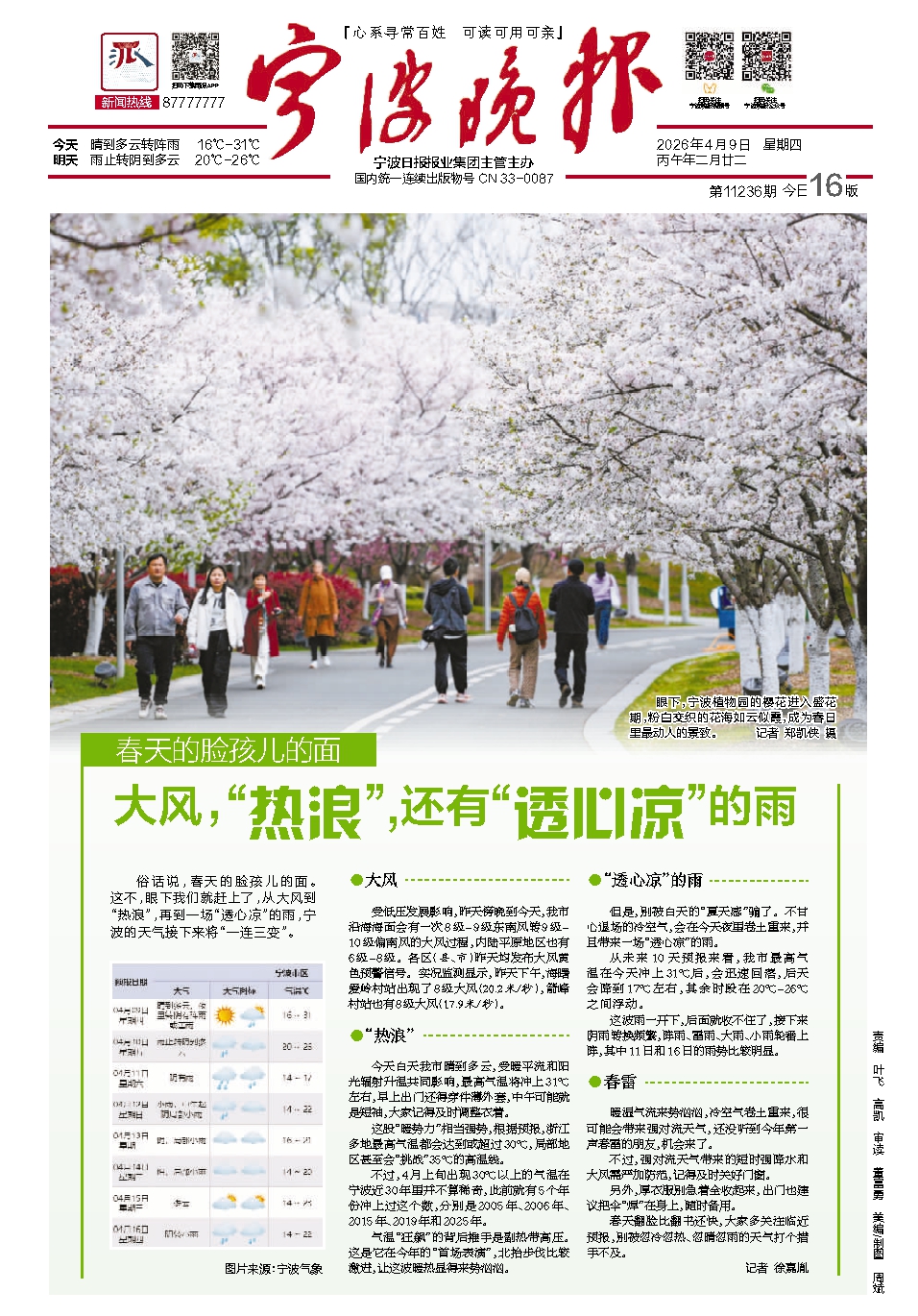 俗话说,春天的脸孩儿的面。这不,眼下我们就赶上了,从大风到“热浪”,再到一场“透心凉”的雨,宁波的天气接下来将“一连三变”。