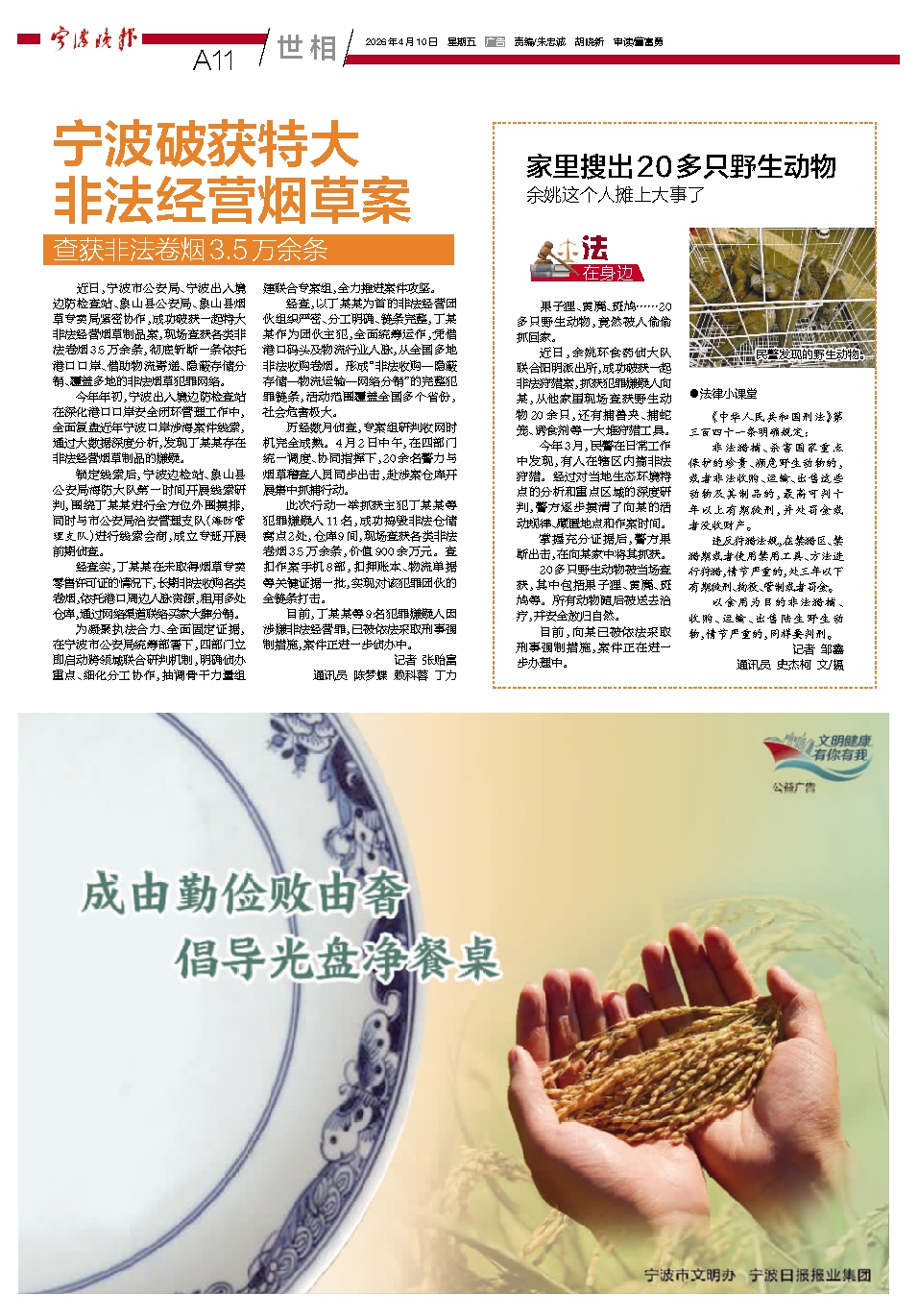 近日,余姚环食药侦大队联合阳明派出所,成功破获一起非法狩猎案,抓获犯罪嫌疑人向某,从他家里现场查获野生动物20余只,还有捕兽夹、捕蛇笼、诱食剂等一大堆狩猎工具。