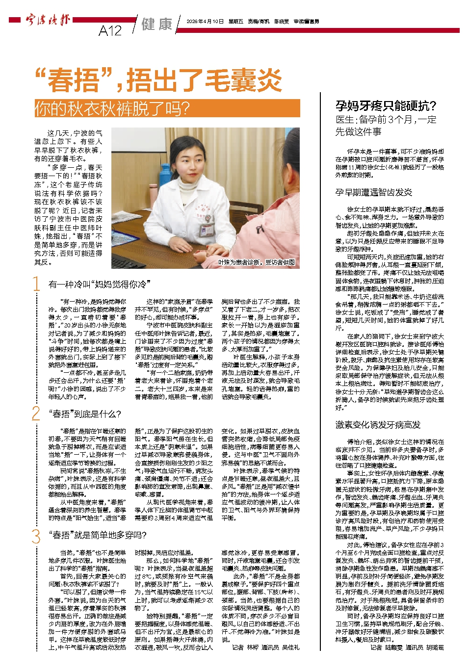 宁波市中医院皮肤科副主任中医师叶姝告诉记者,最近,门诊里来了不少因为过度“春捂”导致皮肤问题的患者。“比较多见的是前胸后背的毛囊炎,跟‘春捂’过度有一定关系。”