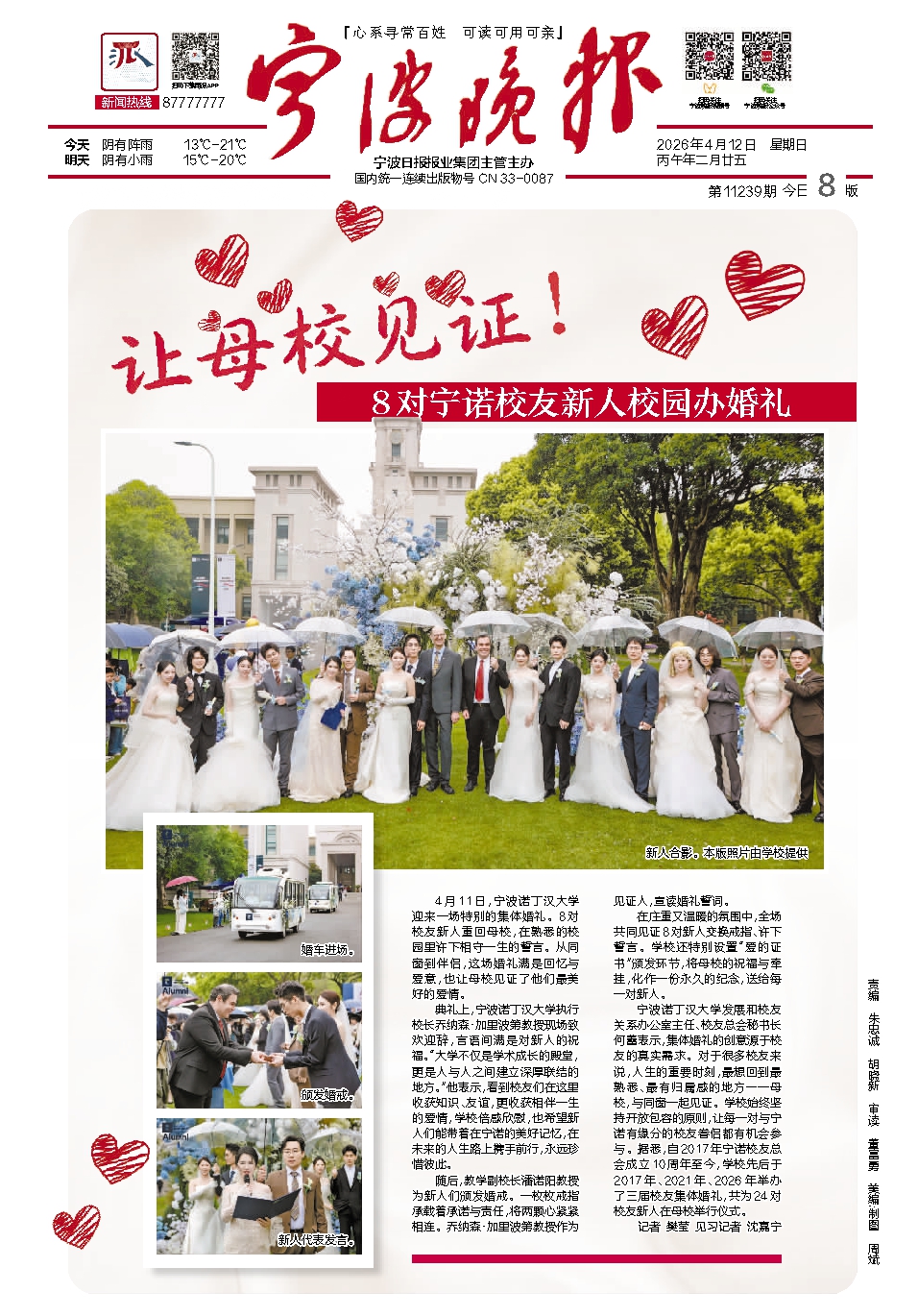 4月11日,宁波诺丁汉大学迎来一场特别的集体婚礼。8对校友新人重回母校,在熟悉的校园里许下相守一生的誓言。从同窗到伴侣,这场婚礼满是回忆与爱意,也让母校见证了他们最美好的爱情。
