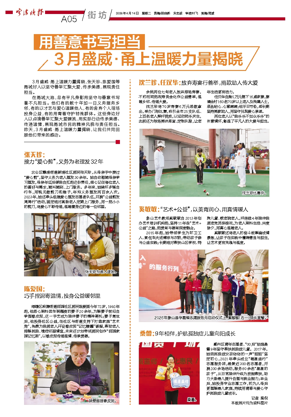 在甬城大地,总有平凡身影用坚守与善意书写着不凡担当。他们有的数十年如一日义务服务乡邻,有的以才艺与爱心温暖他人,有的舍弃个人排场投身公益,有的用青春守护特殊群体。这些身边好人以点滴善举汇聚大爱暖流,用实际行动传承美德、传递温情,展现甬城市民的精神风貌与责任担当。昨天,3月盛威·甬上温暖力量揭晓,让我们共同回顾他们带来的感动。