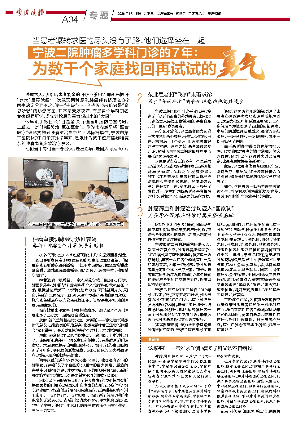 今年4月15日-21日是第32个全国肿瘤防治宣传周,主题之一是“肿瘤防治 赢在整合”。作为市内最早将“整合医疗”理念实施到肿瘤防治当中的区域标杆单位,宁波市第二医院MDT门诊开诊7年来,已累计为数千位病情疑难复杂的肿瘤患者突破治疗禁区。