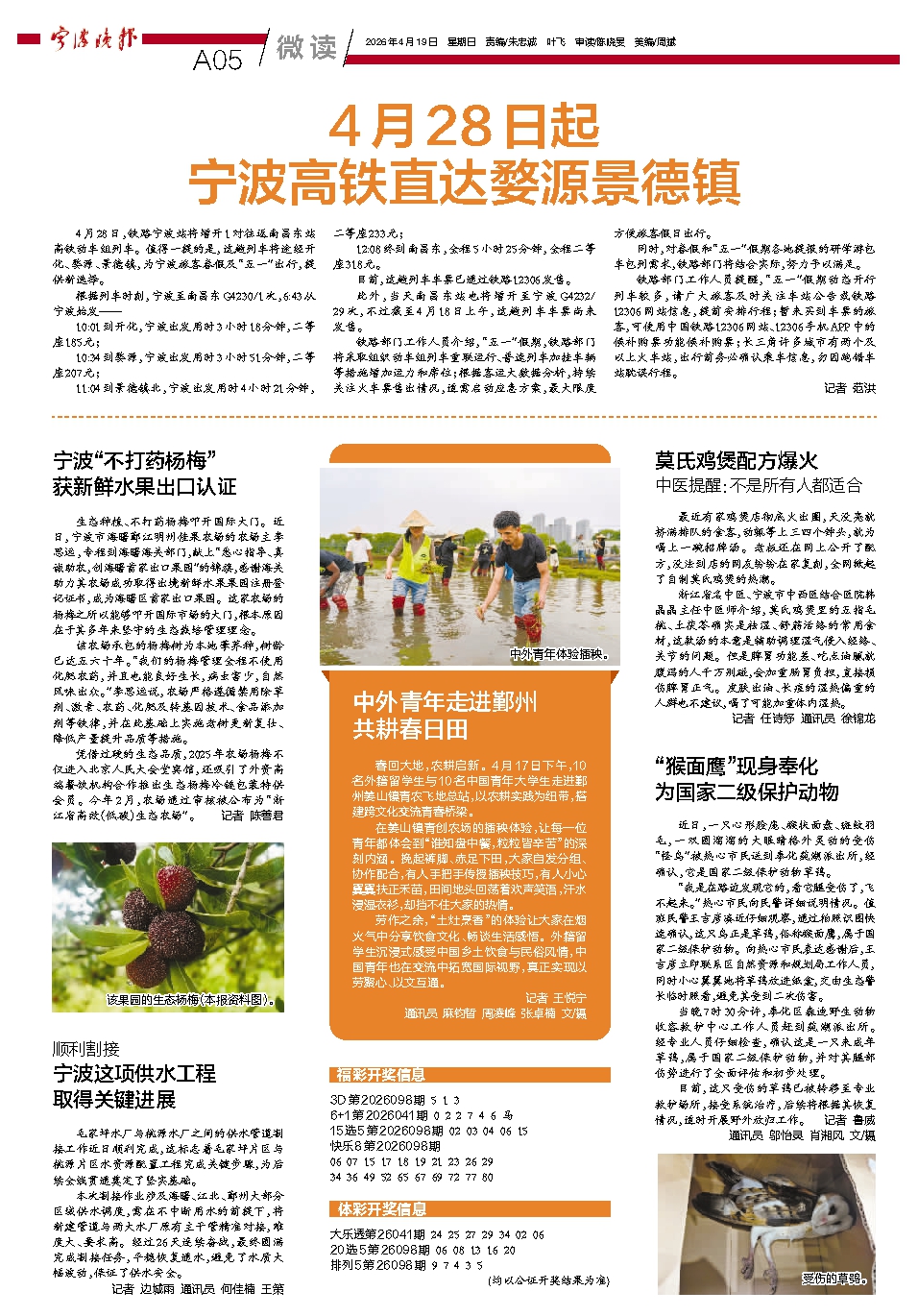 春回大地,农耕启新。4月17日下午,10名外籍留学生与10名中国青年大学生走进鄞州姜山镇青农飞地总站,以农耕实践为纽带,搭建跨文化交流青春桥梁。