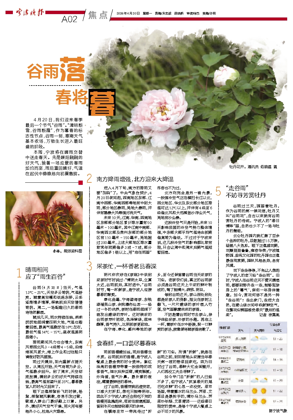 明代许次纾在《茶疏》中谈到采茶时节时说过:“清明太早,立夏太迟,谷雨前后,其时适中。”谷雨时节,喝一杯新茶,是宁波人迎接暮春的默契。