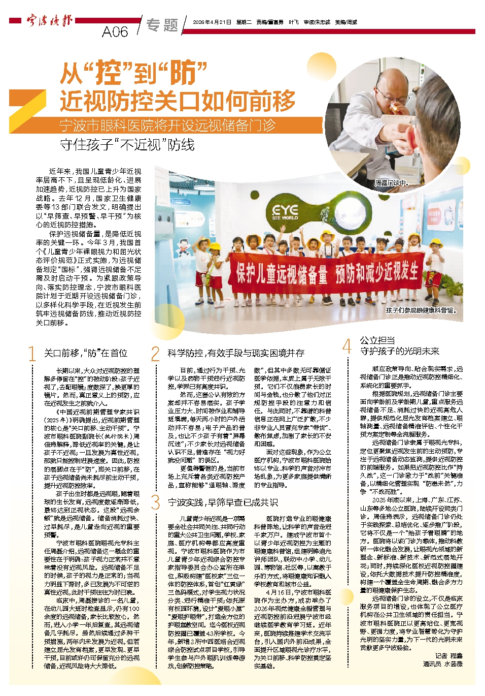儿童青少年近视是一项需要全社会共同关注、共同行动的重大公共卫生问题,学校、家庭、医疗机构等都应高度重视。宁波市眼科医院作为市儿童青少年近视综合防控专家指导委员会办公室所在单位,积极构建“医校家”三位一体的防控体系,首创“红黄绿”三色码模式,对学生视力状况分类、进行精准干预;依托原有校园环境,设计“爱眼小屋”“爱眼护眼带”,打造全方位的护眼宣教空间。迄今医校近视防控圈已覆盖43所学校。今年,新增2所中西医结合近视综合防控试点项目学校,引导学生参与户外眼肌训练等游戏,创新防控策略。