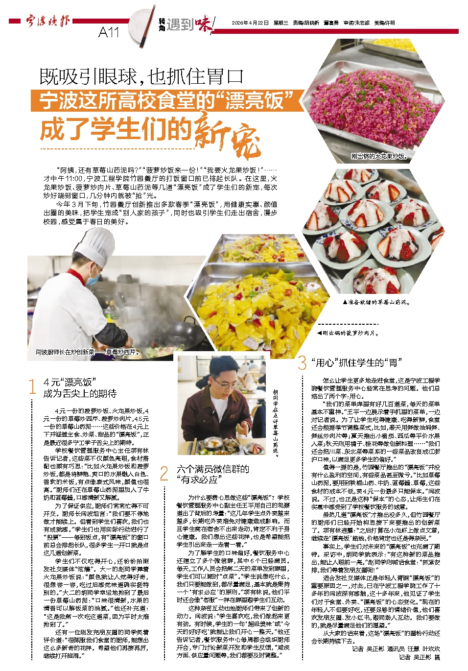 “阿姨,还有草莓山药泥吗?”“菠萝炒饭来一份!”“我要火龙果炒饭!”……才中午11:00,宁波工程学院竹园餐厅的打饭窗口前已排起长队。在这里,火龙果炒饭、菠萝炒肉片、草莓山药泥等几道“漂亮饭”成了学生们的新宠,每次炒好端到窗口,几分钟内就被“抢”光。