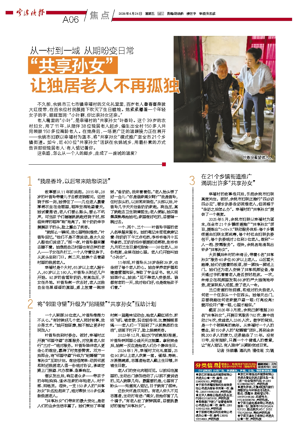 截至2026年3月底,余姚已新增超200名“共享孙女”,开展日常服务782次、集中活动274次,受益老人2385人次。数字的背后,是一个个被照亮的晚年。从幸福村一个人的善念,到150多人的“贴隔壁”团队,再到全余姚200多人的接力,这条路走了11年。没有口号,没有指标,只靠一个个普通人的善意,让“有人惦记、有人陪伴”从期盼变成日常。