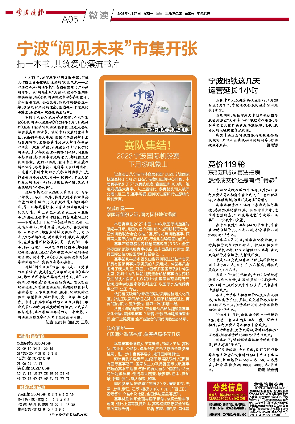 记者近日从宁波市体育局获悉:2026宁波国际帆船赛将于5月21日在宁波象山亚帆中心开赛。本届赛事吸引了57支赛队报名,稳居亚洲J80统一组别规模最大赛事。与上届相比,参赛船队和人数同比增长近三成,赛事规模、国际关注度和行业影响力再创新高。