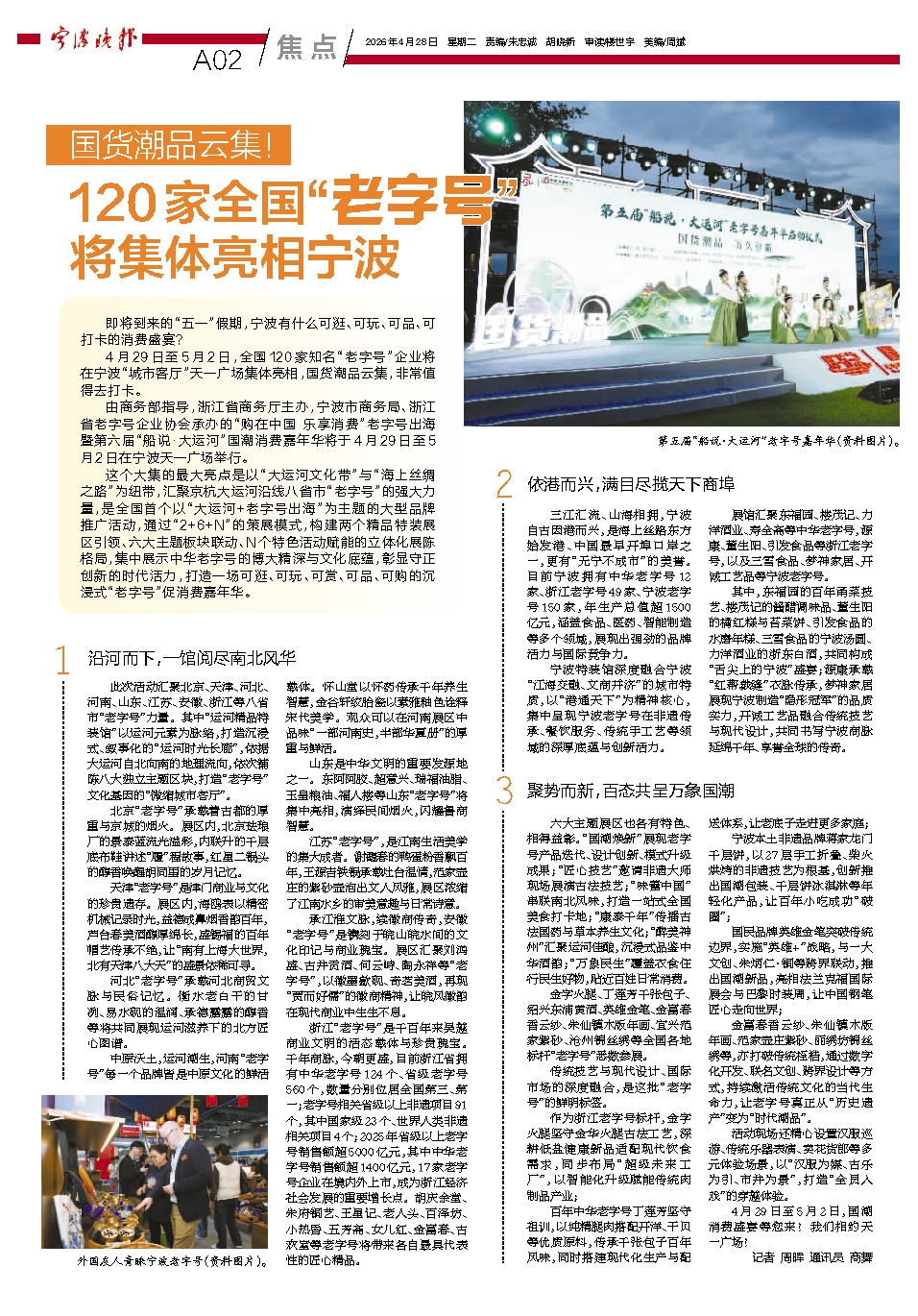 由商务部指导,浙江省商务厅主办,宁波市商务局、浙江省老字号企业协会承办的“购在中国 乐享消费”老字号出海暨第六届“船说·大运河”国潮消费嘉年华将于4月29日至5月2日在宁波天一广场举行。