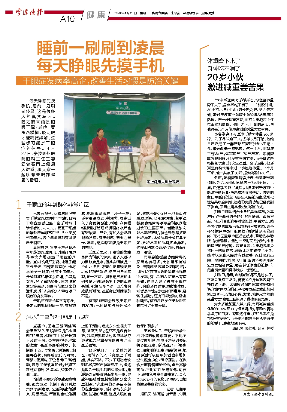 每天睁眼先摸手机,睡前一刷刷到凌晨,这是很多人的真实写照。随之而来的是眼睛干涩、发痒,看东西模糊,眨眨眼才能稍微缓解,这些都可能是干眼症的信号。4月27日,宁波明州医院眼科主任王惠云做客甬上健康大讲堂,和大家一起聊有关眼部健康的话题。