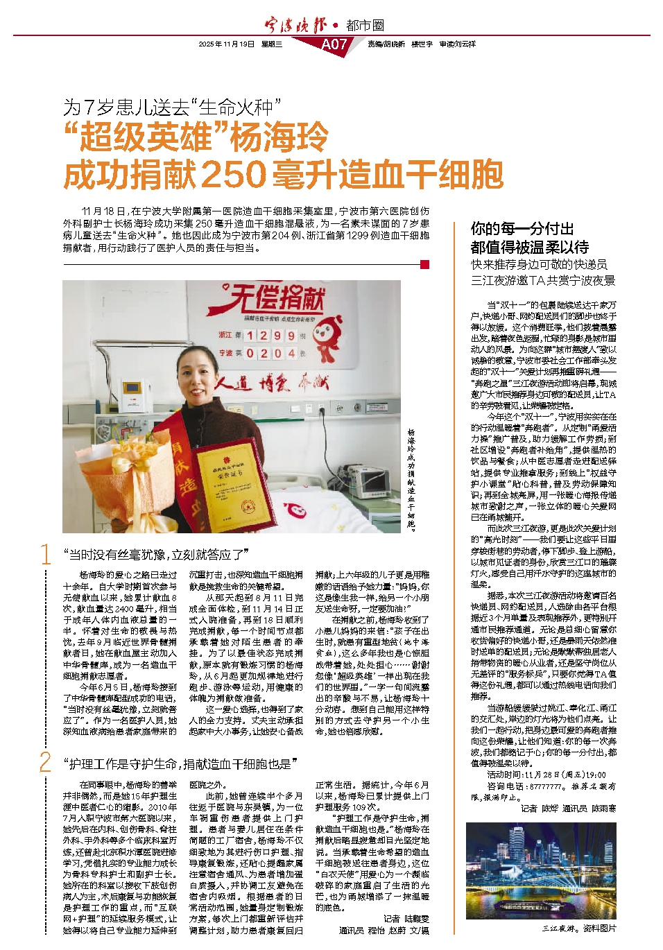“超级英雄”杨海玲成功捐献250毫升造血干细胞