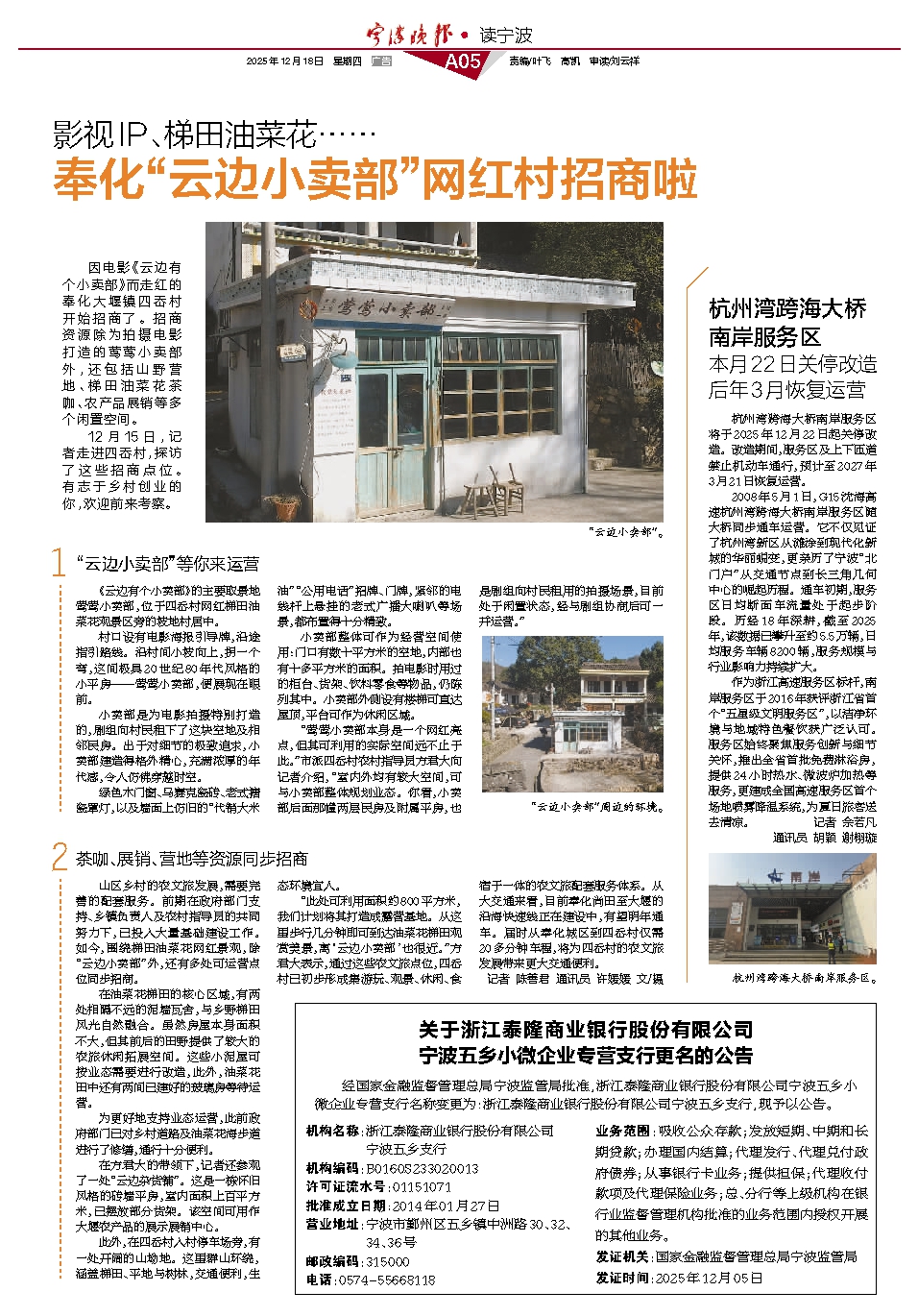 关于浙江泰隆商业银行股份有限公司 宁波五乡小微企业专营支行更名的公告