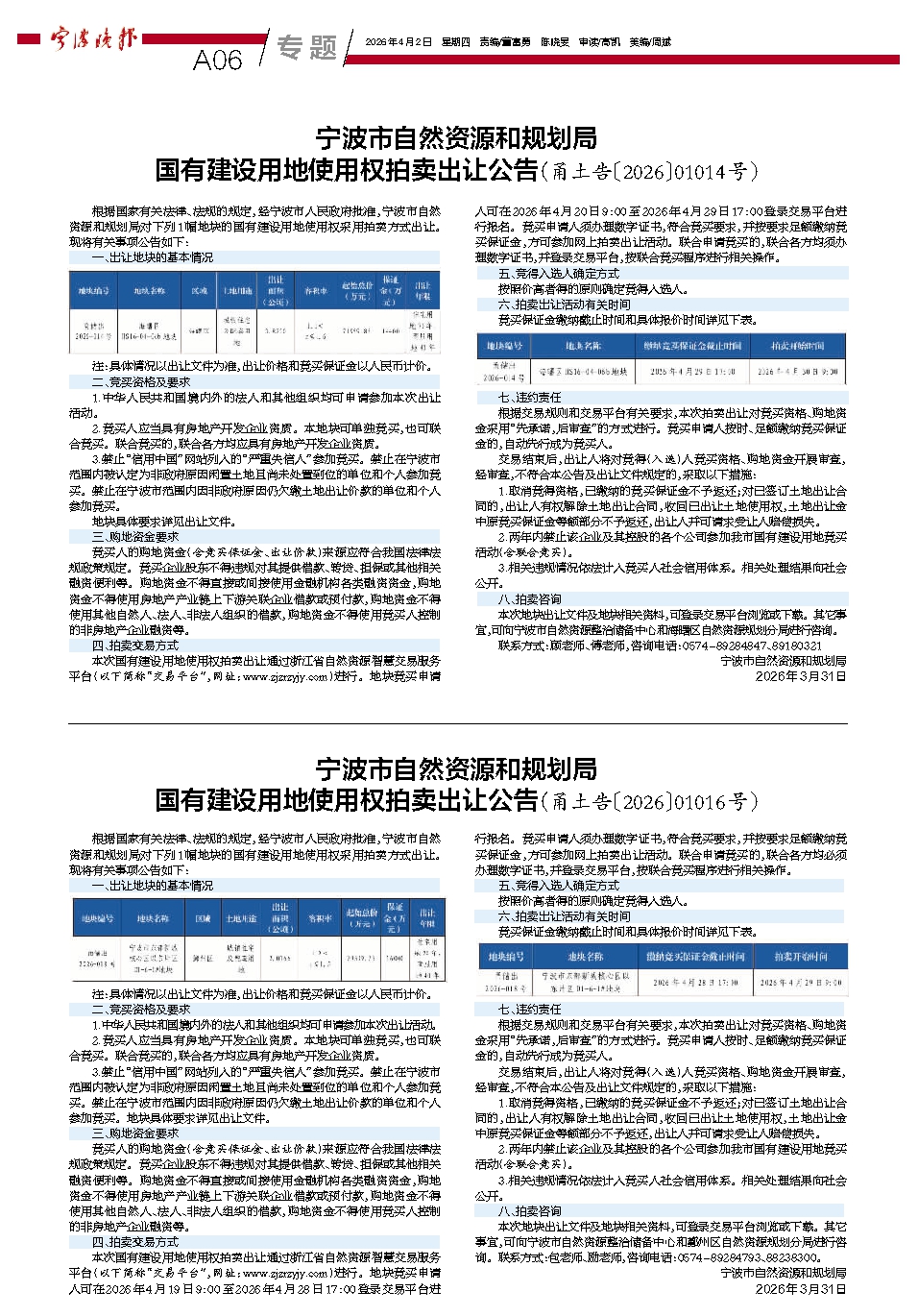 宁波市自然资源和规划局 国有建设用地使用权拍卖出让公告(甬土告〔2026〕01016号)