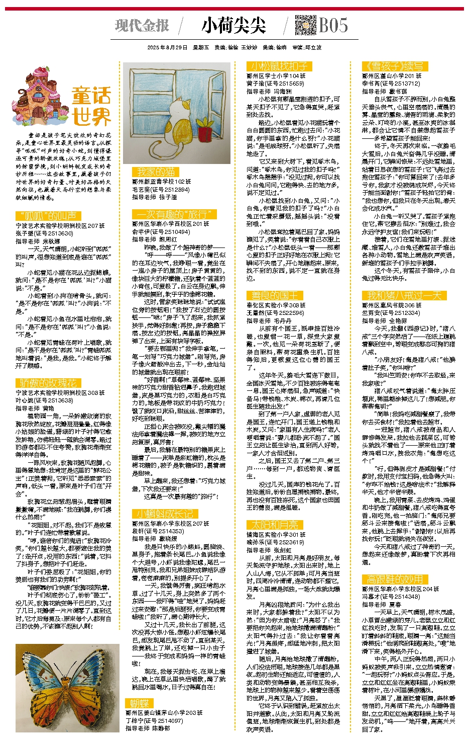 童话是孩子笔尖绽放的奇幻花朵,是童心世界里最灵动的语言。从探寻“呱呱”叫声的好奇小蛇,到懂得谦逊可贵的骄傲玫瑰;从巧克力城堡里的甜蜜梦境,到小蝌蚪蜕变成长的奇妙历程……这些故事里,藏着孩子们对世界的好奇打量、对美好品格的天然向往,也藏着天马行空的想象与柔软细腻的情感。